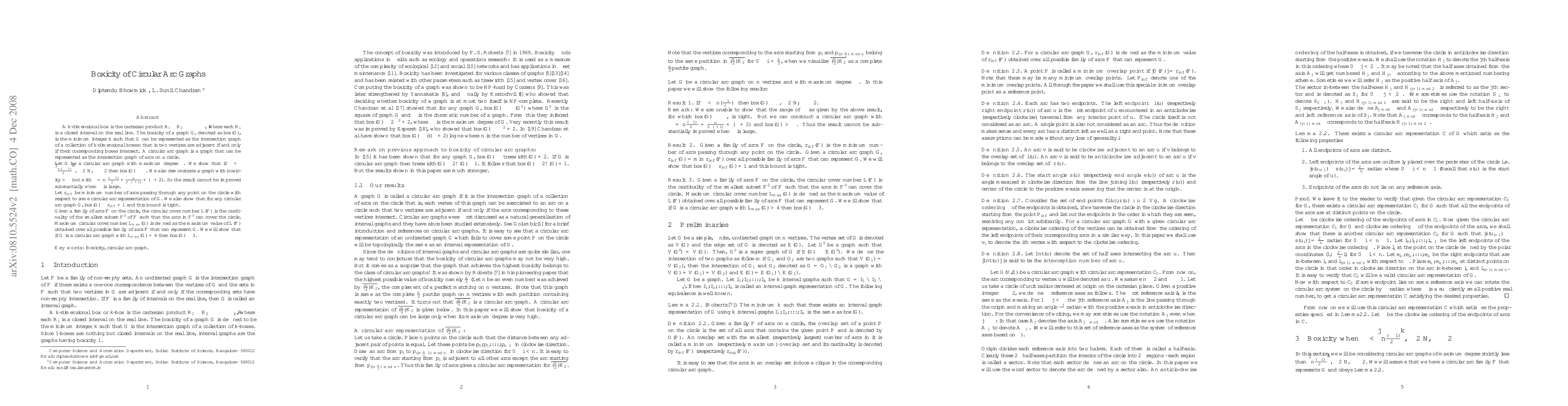 A $k$-dimensional box is the cartesian product $R_1 \times R_2 \times ... \times R_k$ where each $R_i$ is a closed interval on the real line. The {\it boxicity} of a graph $G$, denoted as $box(G)$, is the minimum integer $k$ such that $G$ can be represented as the intersection graph of a collection of $k$-dimensional boxes: that is two vertices are adjacent if and only if their corresponding boxes intersect. A circular arc graph is a graph that can be represented as the intersection graph of arcs on a circle. Let $G$ be a circular arc graph with maximum degree $\Delta$. We show that if $\Delta <\lfloor \frac{n(\alpha-1)}{2\alpha}\rfloor$, $\alpha \in \mathbb{N}$, $\alpha \geq 2$ then $box(G) \leq \alpha$. We also demonstrate a graph with boxicity $> \alpha$ but with $\Delta=n\frac{(\alpha-1)}{2\alpha}+\frac{n}{2\alpha(\alpha+1)}+(\alpha+2)$. So the result cannot be improved substantially when $\alpha$ is large. Let $r_{inf}$ be minimum number of arcs passing through any point on the circle with respect to some circular arc representation of $G$. We also show that for any circular arc graph $G$, $box(G) \leq r_{inf} + 1$ and this bound is tight. Given a family of arcs $F$ on the circle, the circular cover number $L(F)$ is the cardinality of the smallest subset $F'$ of $F$ such that the arcs in $F'$ can cover the circle. Maximum circular cover number $L_{max}(G)$ is defined as the maximum value of $L(F)$ obtained over all possible family of arcs $F$ that can represent $G$. We will show that if $G$ is a circular arc graph with $L_{max}(G)> 4$ then $box(G) \leq 3$.