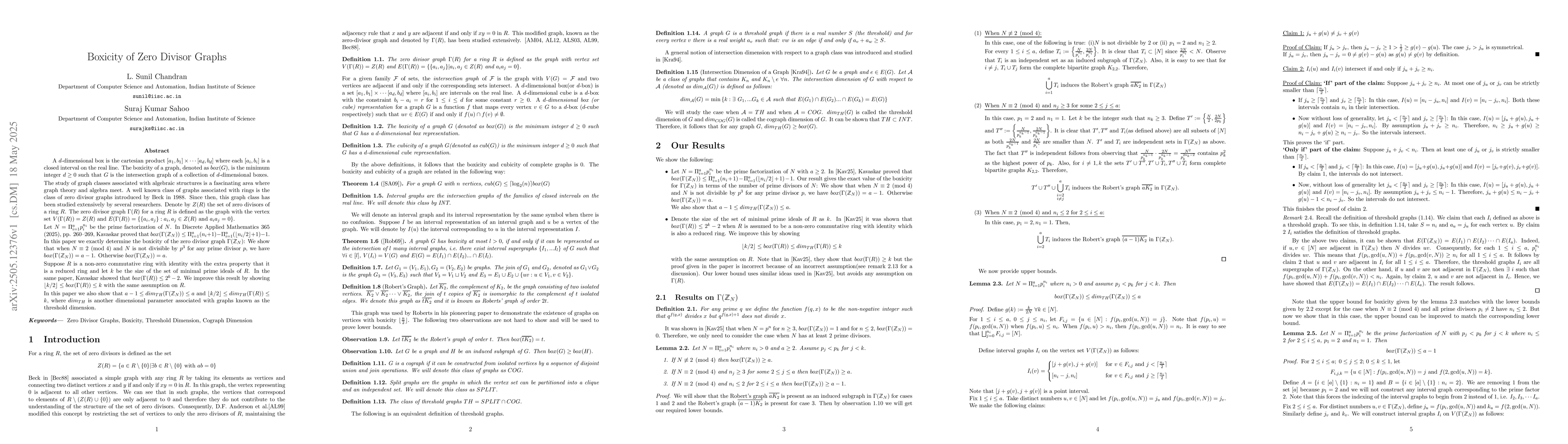 The research analyzes the boxicity of zero divisor graphs, specifically focusing on the ring of integers modulo N, denoted as Z_N, and more generally, reduced commutative rings with identity.