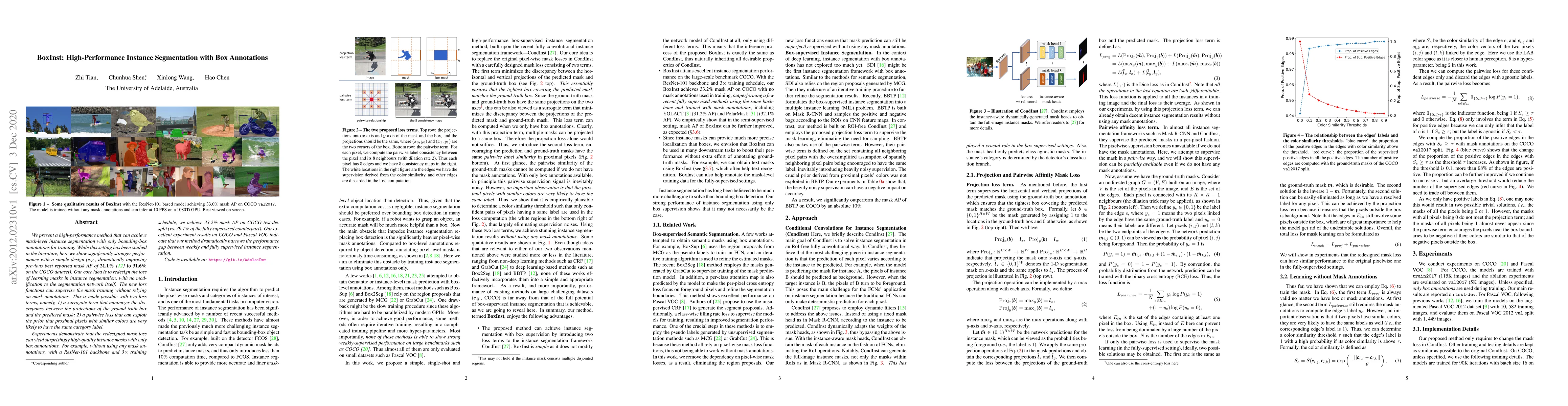 BoxInst presents a high-performance method for instance segmentation using only bounding-box annotations, achieving a significant improvement in mask AP from 21.1% to 31.6% on the COCO dataset. This is accomplished through a redesigned mask loss function with a surrogate term and a pairwise loss, significantly narrowing the performance gap between weakly and fully supervised methods.