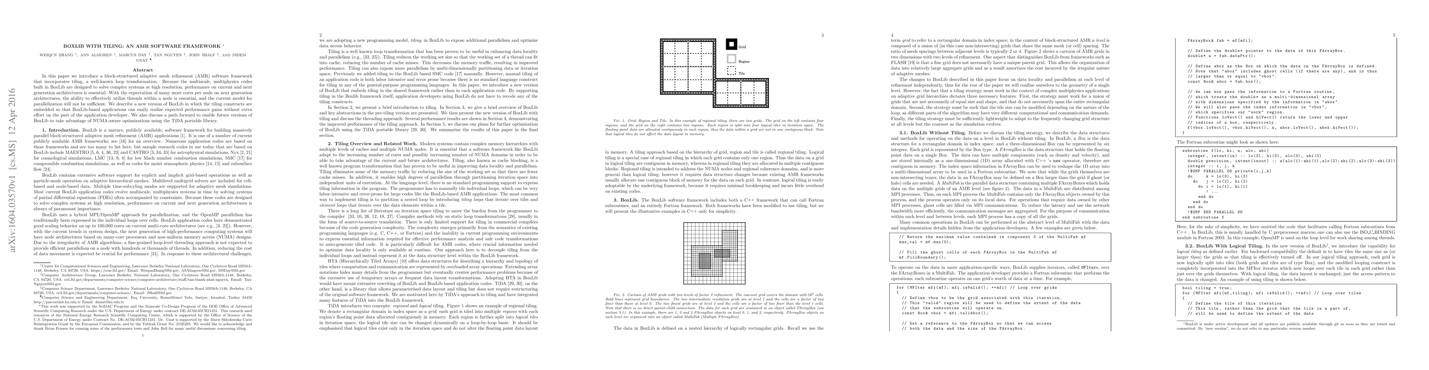 In this paper we introduce a block-structured adaptive mesh refinement (AMR) software framework that incorporates tiling, a well-known loop transformation. Because the multiscale, multiphysics codes built in BoxLib are designed to solve complex systems at high resolution, performance on current and next generation architectures is essential. With the expectation of many more cores per node on next generation architectures, the ability to effectively utilize threads within a node is essential, and the current model for parallelization will not be sufficient. We describe a new version of BoxLib in which the tiling constructs are embedded so that BoxLib-based applications can easily realize expected performance gains without extra effort on the part of the application developer. We also discuss a path forward to enable future versions of BoxLib to take advantage of NUMA-aware optimizations using the TiDA portable library.
