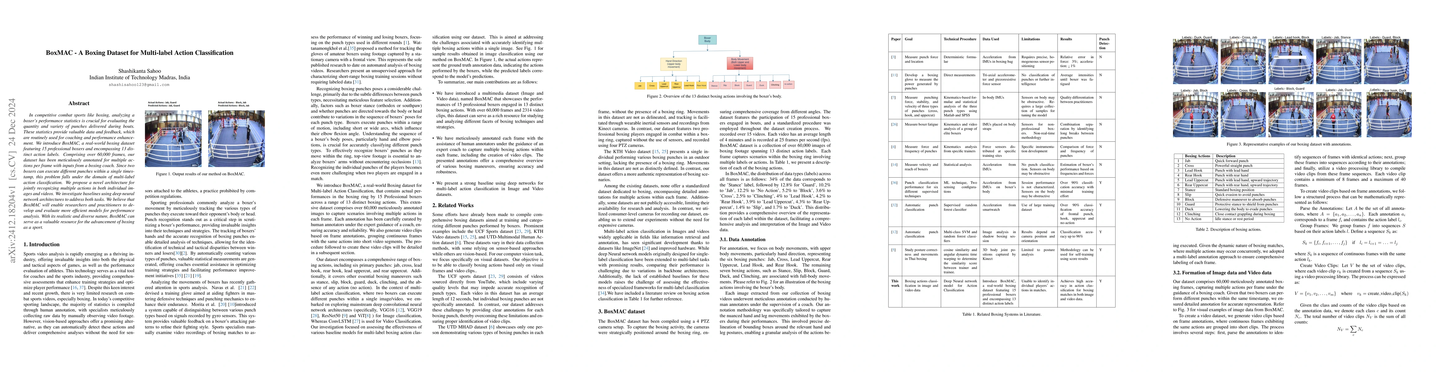 BoxMAC is a meticulously annotated boxing dataset featuring 15 professional boxers and 13 distinct action labels, designed to facilitate multi-label action classification in combat sports. The dataset aims to support the development of efficient models for performance analysis and coaching.