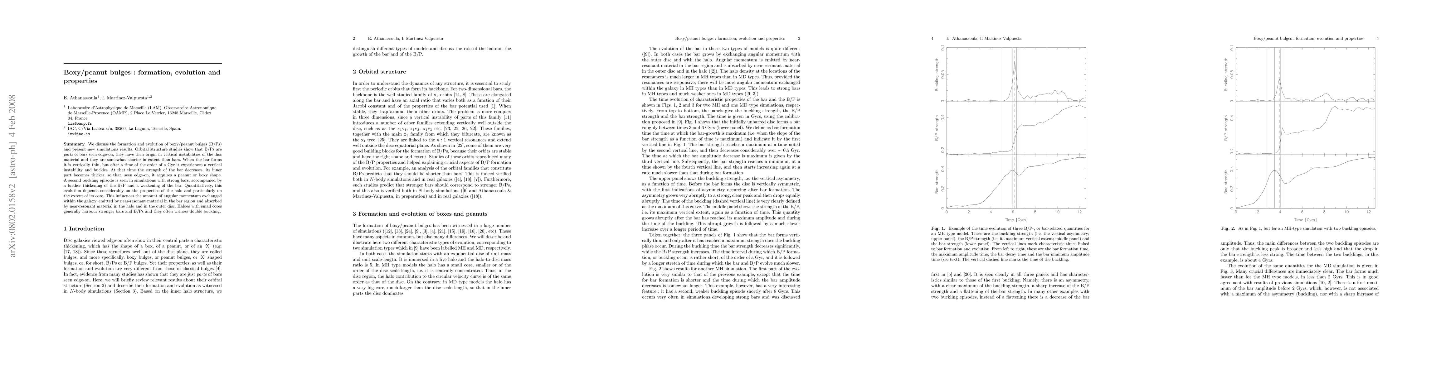 We discuss the formation and evolution of boxy/peanut bulges (B/Ps) and present new simulations results. Orbital structure studies show that B/Ps are parts of bars seen edge-on, they have their origin in vertical instabilities of the disc material and they are somewhat shorter in extent than bars. When the bar forms it is vertically thin, but after a time of the order of a Gyr it experiences a vertical instability and buckles. At that time the strength of the bar decreases, its inner part becomes thicker, so that, seen edge-on, it acquires a peanut or boxy shape. A second buckling episode is seen in simulations with strong bars, accompanied by a further thickening of the B/P and a weakening of the bar. Quantitatively, this evolution depends considerably on the properties of the halo and particularly on the extent of its core. This influences the amount of angular momentum exchanged within the galaxy, emitted by near-resonant material in the bar region and absorbed by near-resonant material in the halo and in the outer disc. Haloes with small cores generally harbour stronger bars and B/Ps and they often witness double buckling.