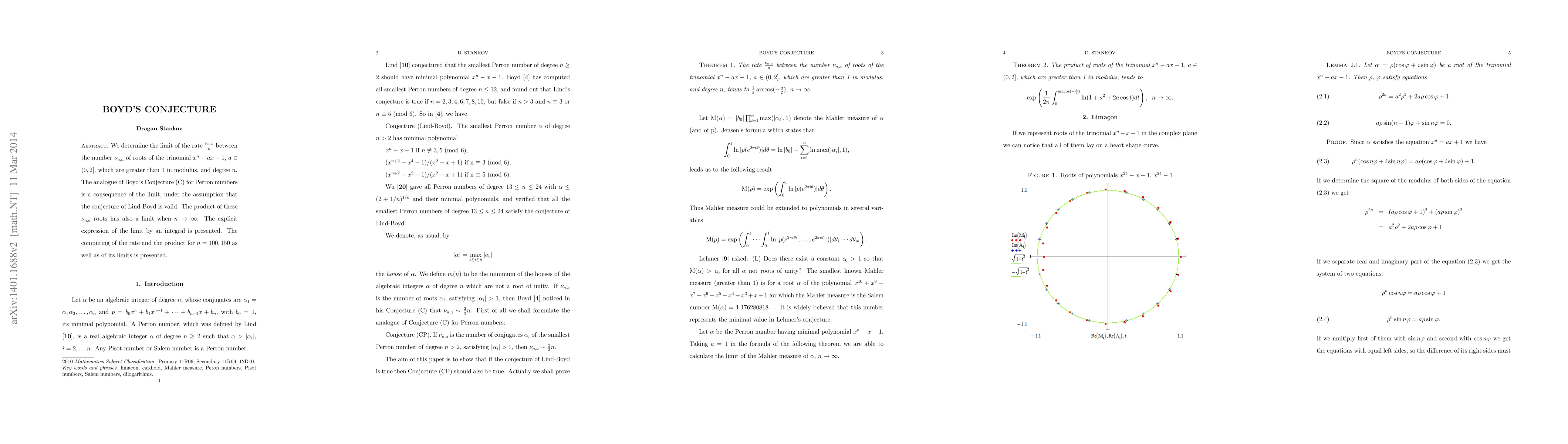 We determine the limit of the rate $\frac{\nu_{n,a}}{n}$ between the number $\nu_{n,a}$ of roots of the trinomial $x^n-ax-1$, $a\in (0,2]$, which are greater than 1 in modulus, and degree $n$. The analogue of Boyd's Conjecture (C) for Perron numbers is a consequence of the limit, under the assumption that the conjecture of Lind-Boyd is valid. The product of these $\nu_{n,a}$ roots has also a limit when $n\to\infty$. The explicit expression of the limit by an integral is presented. The computing of the rate and the product for $n=100,150$ as well as of its limits is presented.