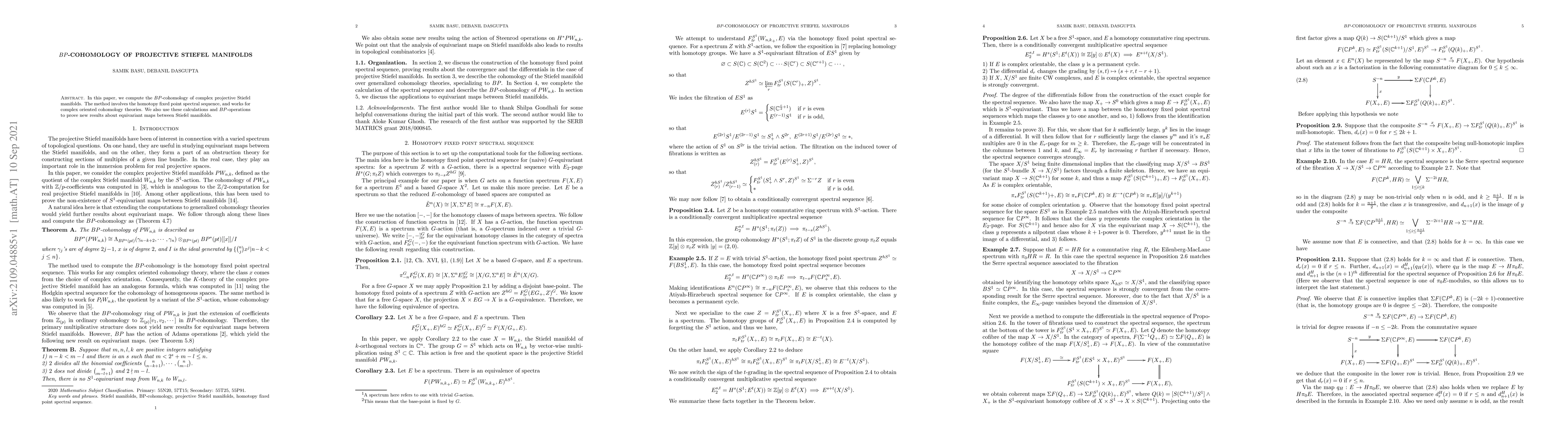 This paper computes the BP-cohomology of complex projective Stiefel manifolds using the homotopy fixed point spectral sequence, applicable to complex oriented cohomology theories, and leverages these findings to derive new insights on equivariant maps between Stiefel manifolds.