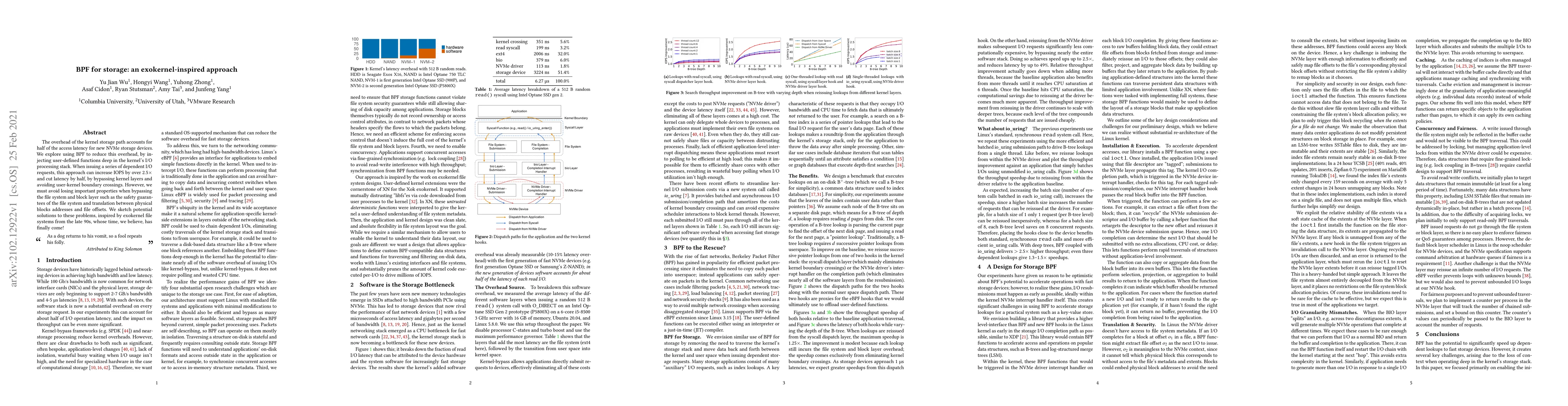 This paper investigates leveraging BPF to inject user-defined functions into the kernel's I/O stack, aiming to reduce the overhead of the kernel storage path for NVMe devices. This approach can significantly boost IOPS and halve latency by minimizing kernel interactions, though it poses challenges in maintaining file system safety and address translation.