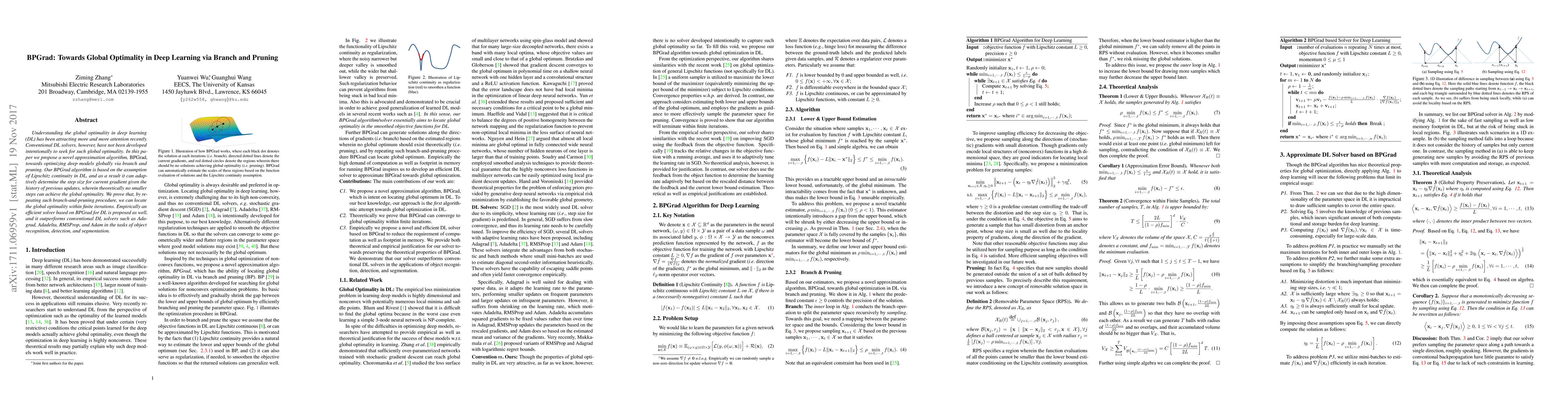 BPGrad is a novel algorithm designed to achieve global optimality in deep learning by employing a branch and pruning approach. It adaptively determines gradient step sizes based on Lipschitz continuity, theoretically ensuring no smaller steps can reach global optimality, and empirically outperforms conventional solvers in tasks like object recognition and segmentation.