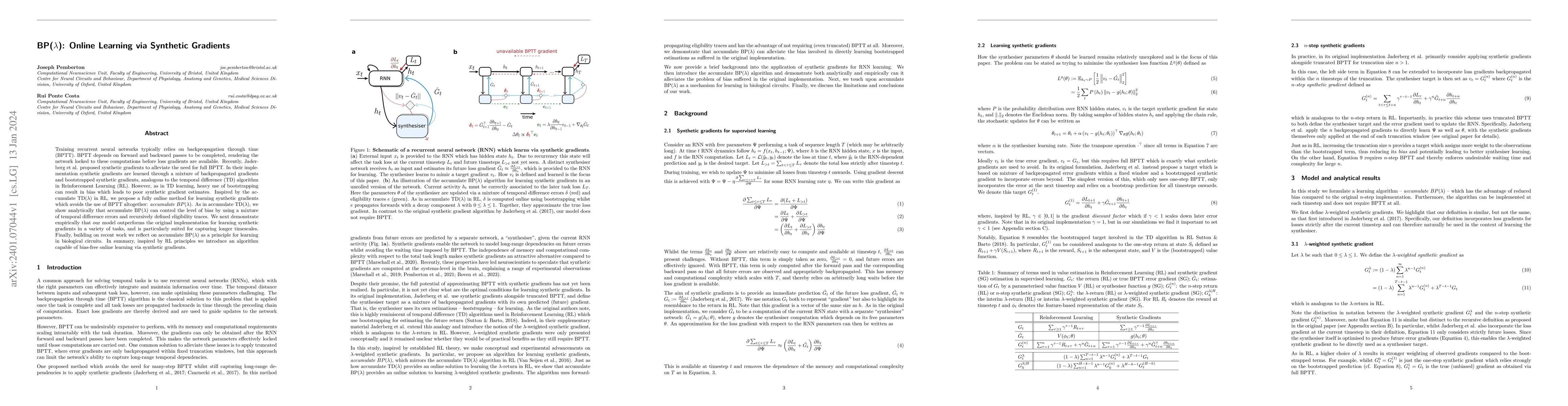 The paper proposes accumulate BP($\lambda$), a fully online learning method for recurrent neural networks that uses synthetic gradients to avoid backpropagation through time (BPTT). It leverages a mixture of temporal difference errors and eligibility traces to control bias, outperforming previous methods and showing better performance for capturing longer timescales.