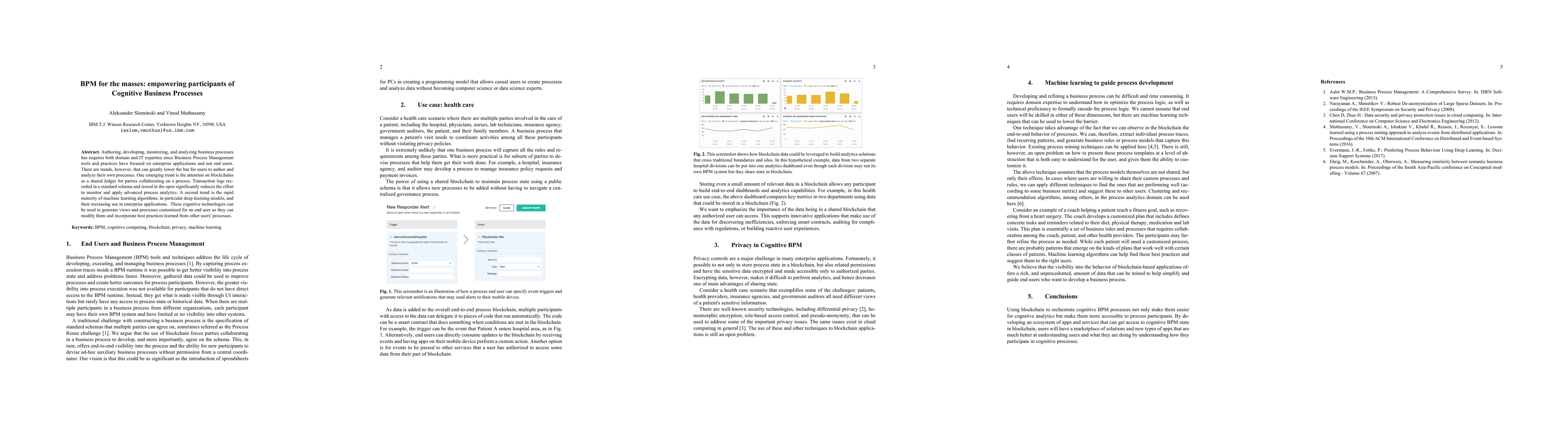 Authoring, developing, monitoring, and analyzing business processes has requires both domain and IT expertise since Business Process Management tools and practices have focused on enterprise applications and not end users. There are trends, however, that can greatly lower the bar for users to author and analyze their own processes. One emerging trend is the attention on blockchains as a shared ledger for parties collaborating on a process. Transaction logs recorded in a standard schema and stored in the open significantly reduces the effort to monitor and apply advanced process analytics. A second trend is the rapid maturity of machine learning algorithms, in particular deep learning models, and their increasing use in enterprise applications. These cognitive technologies can be used to generate views and processes customized for an end user so they can modify them and incorporate best practices learned from other users' processes. Keywords: BPM, cognitive computing, blockchain, privacy, machine learning