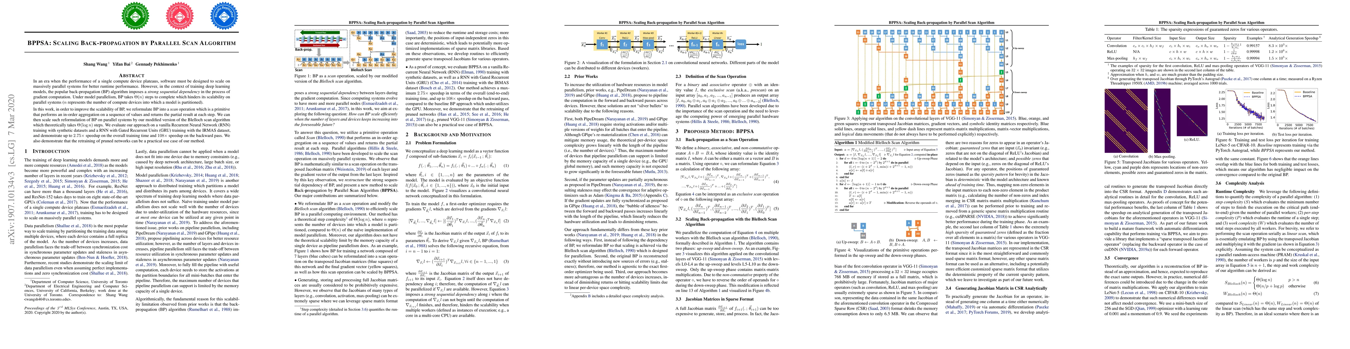 This paper proposes BPPSA, a method to scale back-propagation by reformulating it as a parallel scan operation using a modified Blelloch scan algorithm, achieving $\Theta (\log n)$ steps instead of $\Theta (n)$. Experimental results show significant speedups in training time for RNNs on parallel systems.