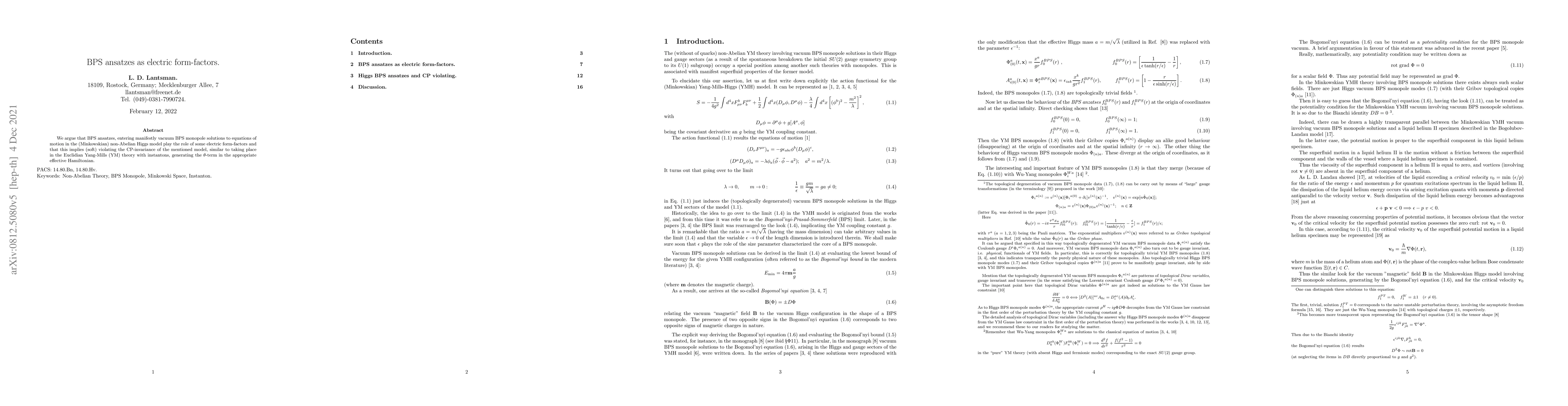 We argue that BPS ansatzes, entering manifestly vacuum BPS monopole solutions to equations of motion in the (Minkowskian) non-Abelian Higgs model play the role of some electric form-factors and that this implies (soft) violating the CP-invariance of the mentioned model, similar to taking place in the Euclidian Yang-Mills (YM) theory with instantons, generating the $\theta$-term in the appropriate effective Hamiltonian.