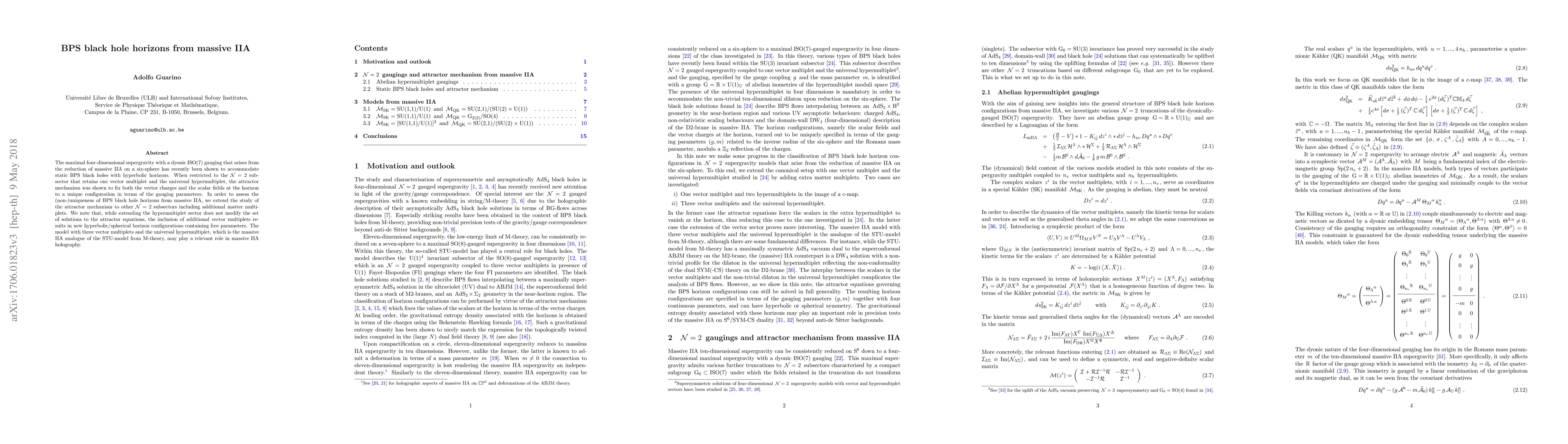 The maximal four-dimensional supergravity with a dyonic ISO(7) gauging that arises from the reduction of massive IIA on a six-sphere has recently been shown to accommodate static BPS black holes with hyperbolic horizons. When restricted to the N=2 subsector that retains one vector multiplet and the universal hypermultiplet, the attractor mechanism was shown to fix both the vector charges and the scalar fields at the horizon to a unique configuration in terms of the gauging parameters. In order to assess the (non-)uniqueness of BPS black hole horizons from massive IIA, we extend the study of the attractor mechanism to other N=2 subsectors including additional matter multiplets. We note that, while extending the hypermultiplet sector does not modify the set of solutions to the attractor equations, the inclusion of additional vector multiplets results in new hyperbolic/spherical horizons containing free parameters. The model with three vector multiplets and the universal hypermultiplet, which is the massive IIA analogue of the STU-model from M-theory, may play a relevant role in massive IIA holography.
