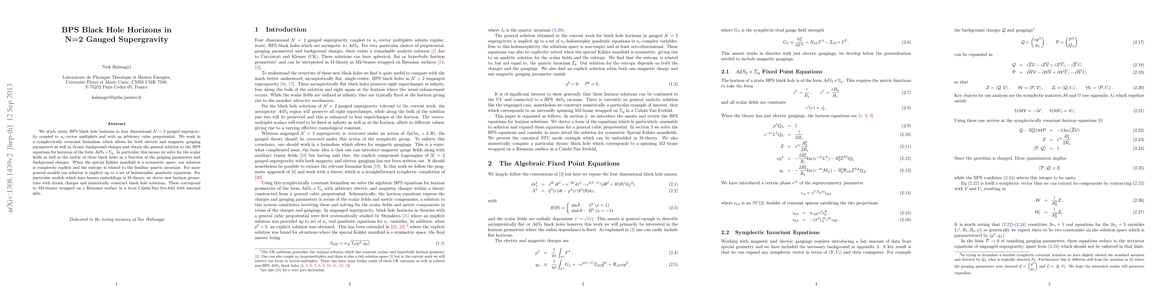 This paper explores static BPS black hole horizons in four-dimensional N=2 gauged supergravity, solving the BPS equations for $AdS_2\times \Sigma_g$ horizons and deriving scalar fields and metrics. For symmetric spaces, the entropy relates to a quartic invariant.