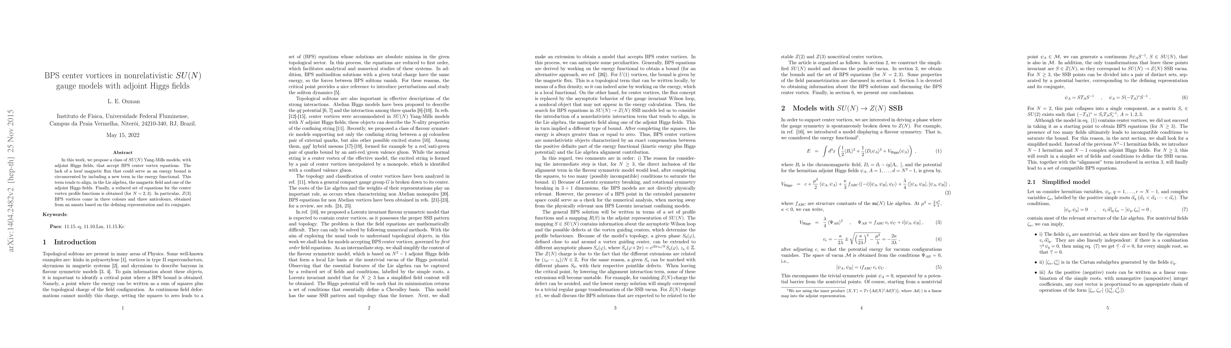 This research proposes SU(N) Yang-Mills models with adjoint Higgs fields that support BPS center vortex equations, overcoming the absence of a local magnetic flux bound by adding a new term to the energy functional. A reduced set of equations for center vortex profiles is derived for N=2,3, revealing Z(3) BPS vortices in three colors and anticolors based on the defining representation and its conjugate.