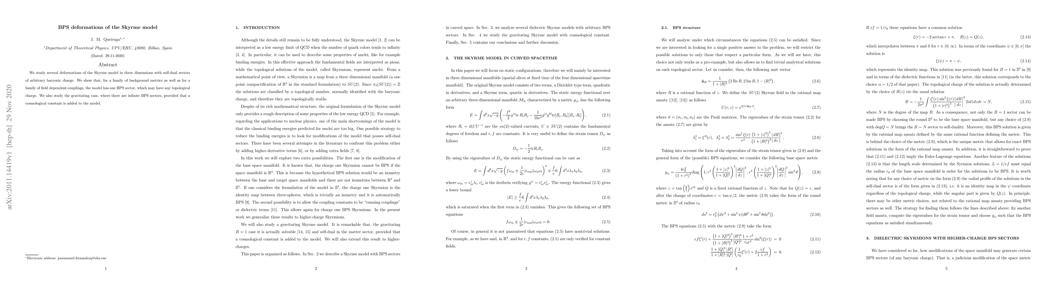 This paper explores deformations of the Skyrme model in three dimensions, demonstrating that it possesses a single BPS sector with arbitrary topological charge under specific background metrics and field-dependent couplings. Additionally, the gravitating version with a cosmological constant exhibits an infinite number of BPS sectors.