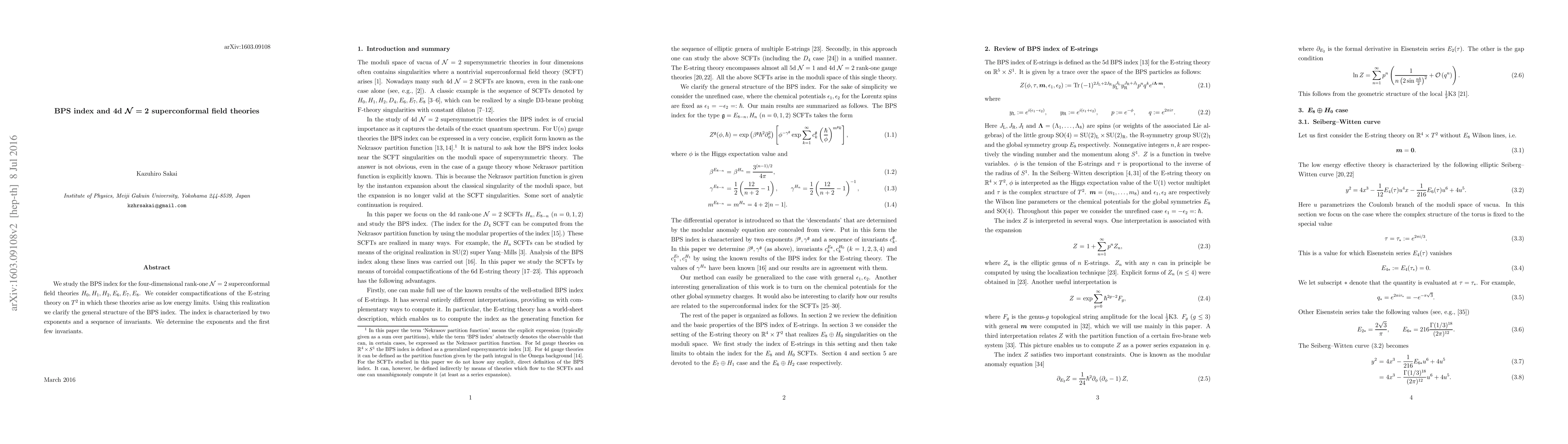 This paper investigates the BPS index for four-dimensional N=2 superconformal field theories, revealing its structure characterized by two exponents and a sequence of invariants. The study uses compactifications of E-string theory on T^2 to determine these features for specific theories.