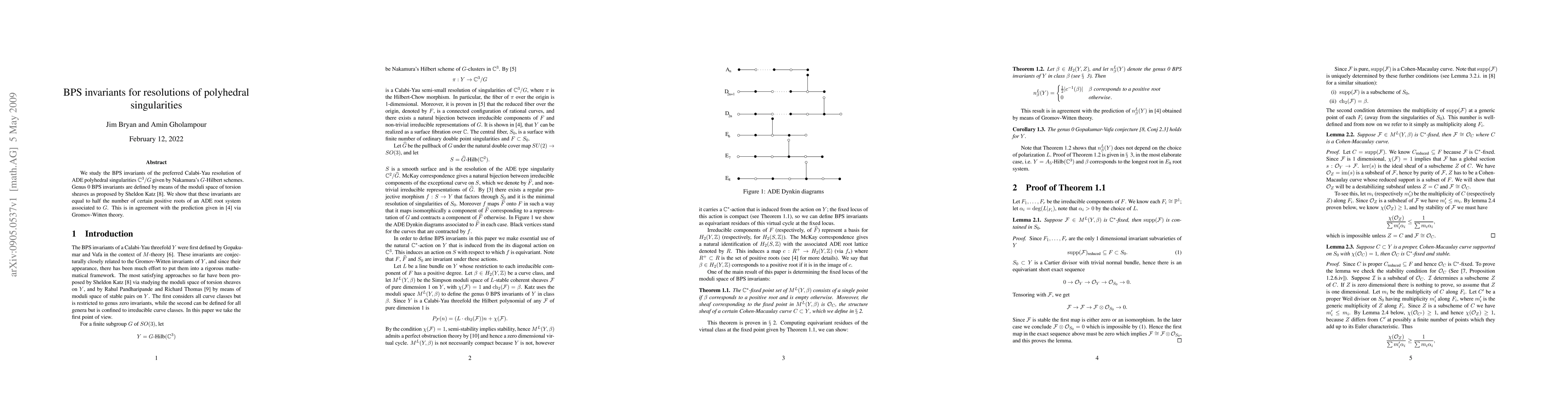 We study the BPS invariants of the preferred Calabi-Yau resolution of ADE polyhedral singularities C^3/G given by Nakamura's G-Hilbert schemes. Genus 0 BPS invariants are defined by means of the moduli space of torsion sheaves as proposed by Sheldon Katz. We show that these invariants are equal to half the number of certain positive roots of an ADE root system associated to G. This is in agreement with the prediction via Gromov-Witten theory.