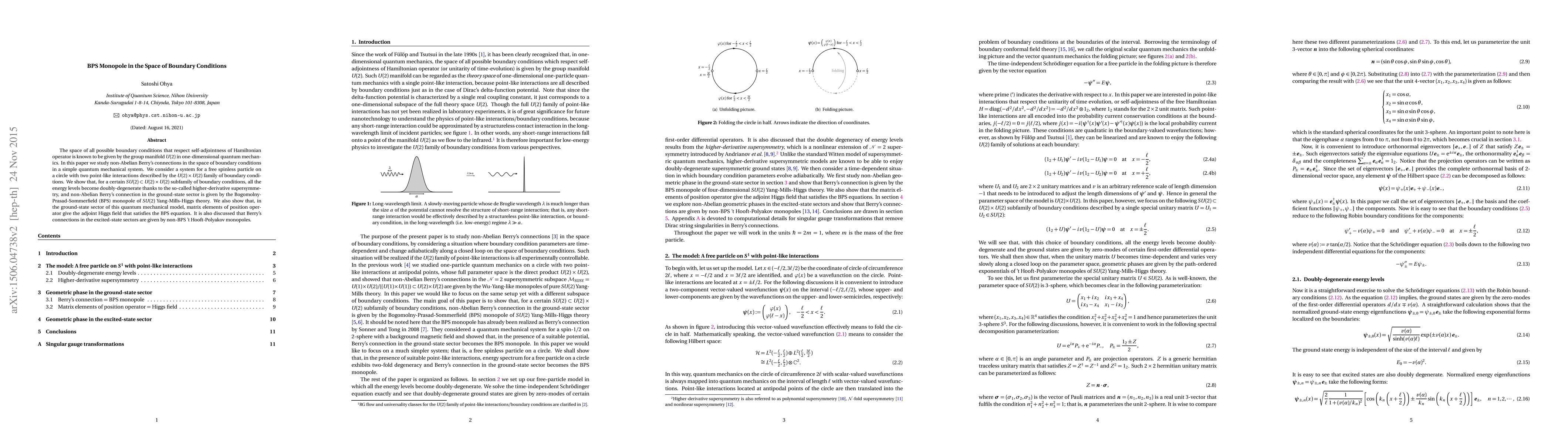 The space of all possible boundary conditions that respect self-adjointness of Hamiltonian operator is known to be given by the group manifold $U(2)$ in one-dimensional quantum mechanics. In this paper we study non-Abelian Berry's connections in the space of boundary conditions in a simple quantum mechanical system. We consider a system for a free spinless particle on a circle with two point-like interactions described by the $U(2) \times U(2)$ family of boundary conditions. We show that, for a certain $SU(2) \subset U(2) \times U(2)$ subfamily of boundary conditions, all the energy levels become doubly-degenerate thanks to the so-called higher-derivative supersymmetry, and non-Abelian Berry's connection in the ground-state sector is given by the Bogomolny-Prasad-Sommerfield (BPS) monopole of $SU(2)$ Yang-Mills-Higgs theory. We also show that, in the ground-state sector of this quantum mechanical model, matrix elements of position operator give the adjoint Higgs field that satisfies the BPS equation. It is also discussed that Berry's connections in the excited-state sectors are given by non-BPS 't Hooft-Polyakov monopoles.