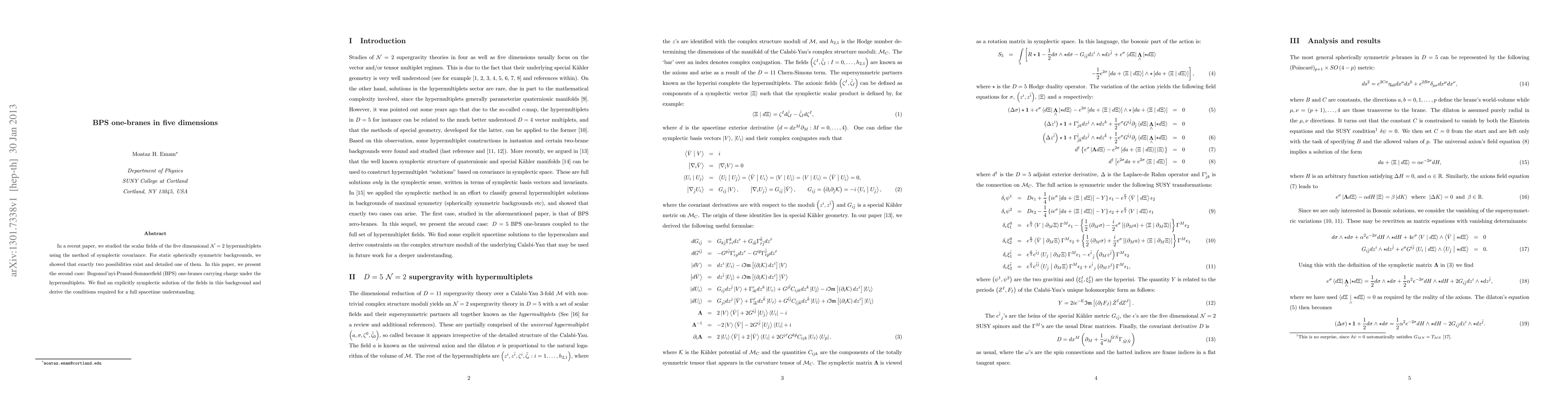 In a recent paper, we studied the scalar fields of the five dimensional N=2 hypermultiplets using the method of symplectic covariance. For static spherically symmetric backgrounds, we showed that exactly two possibilities exist and detailed one of them. In this paper, we present the second case: Bogomol'nyi-Prasad-Sommerfield (BPS) one-branes carrying charge under the hypermultiplets. We find an explicitly symplectic solution of the fields in this background and derive the conditions required for a full spacetime understanding.