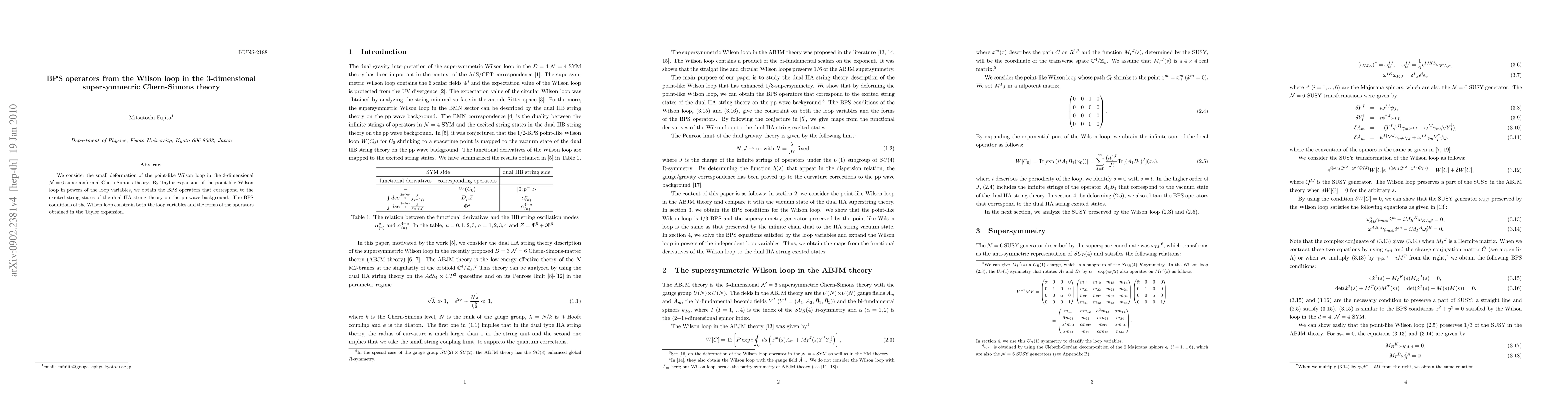 This paper explores the small deformation of point-like Wilson loops in 3D $\mathcal{N}=6$ supersymmetric Chern-Simons theory, deriving BPS operators via Taylor expansion that correspond to excited string states in dual IIA string theory on a pp wave background. The BPS conditions of the Wilson loop dictate both the loop variables and the operator forms.