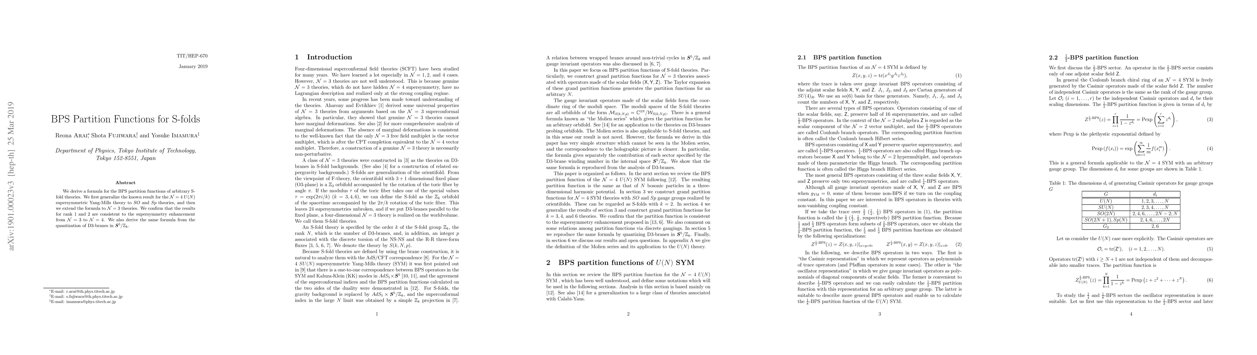 We derive a formula for the BPS partition functions of arbitrary S-fold theories. We first generalize the known result for the ${\cal N}=4$ $U(N)$ supersymmetric Yang-Mills theory to $SO$ and $Sp$ theories, and then we extend the formula to ${\cal N}=3$ theories. We confirm that the results for rank $1$ and $2$ are consistent to the supersymmetry enhancement from ${\cal N}=3$ to ${\cal N}=4$. We also derive the same formula from the quantization of D3-branes in $\boldsymbol{S}^5/\mathbb{Z}_k$.
