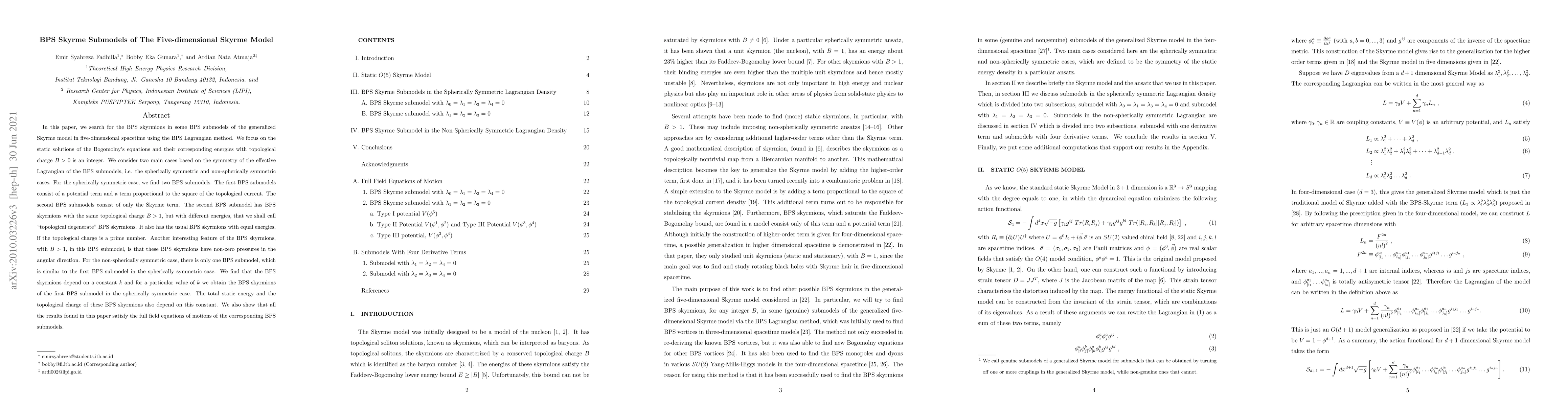 This paper explores BPS skyrmions in two BPS submodels of the five-dimensional Skyrme model, focusing on static solutions and their energies. It identifies "topological degenerate" BPS skyrmions in one submodel, which exhibit non-zero pressures in the angular direction. The results satisfy the full field equations of the corresponding submodels.