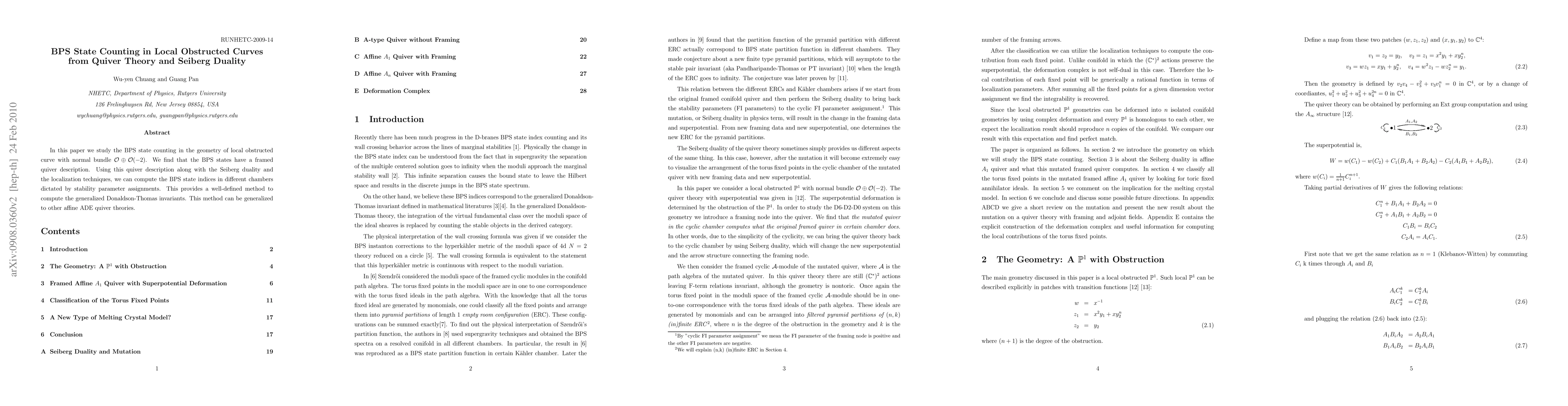 This paper explores BPS state counting in obstructed curves with a normal bundle O+O(-2) using quiver theory and Seiberg duality. It employs a framed quiver description to compute BPS state indices, providing a method for generalized Donaldson-Thomas invariants applicable to other affine ADE quiver theories.