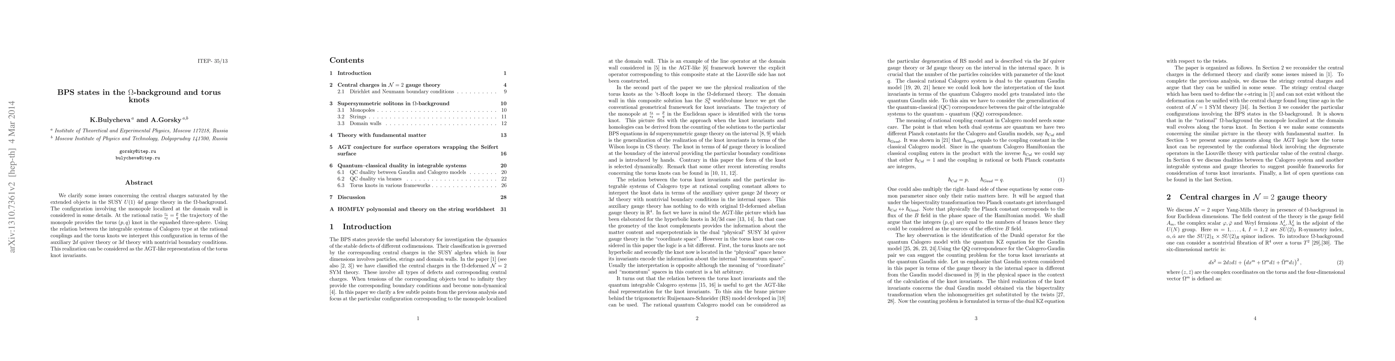 We clarify some issues concerning the central charges saturated by the extended objects in the SUSY $U(1)$ $4d$ gauge theory in the $\Omega$-background. The configuration involving the monopole localized at the domain wall is considered in some details. At the rational ratio $\frac{\epsilon_1}{\epsilon_2}=\frac{p}{q}$ the trajectory of the monopole provides the torus $(p,q)$ knot in the squashed three-sphere. Using the relation between the integrable systems of Calogero type at the rational couplings and the torus knots we interpret this configuration in terms of the auxiliary $2d$ quiver theory or $3d$ theory with nontrivial boundary conditions. This realization can be considered as the AGT-like representation of the torus knot invariants.