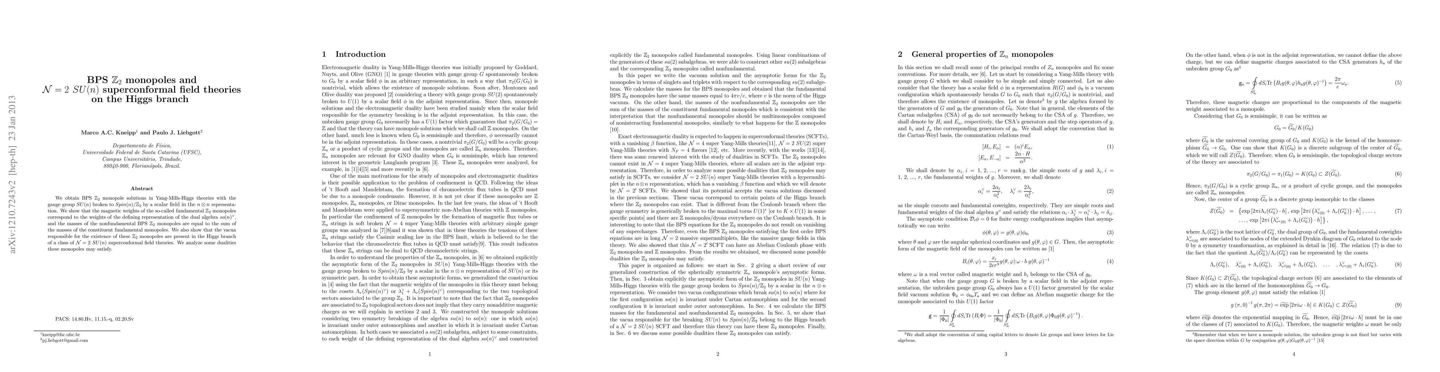 This paper presents BPS Z(2) monopole solutions in SU(n) gauge theories with spontaneous symmetry breaking to Spin(n)/Z(2), linking their magnetic weights to the dual algebra of so(n). It also reveals that these monopoles exist in the Higgs branch of certain N=2 SU(n) superconformal field theories and discusses their potential dualities.