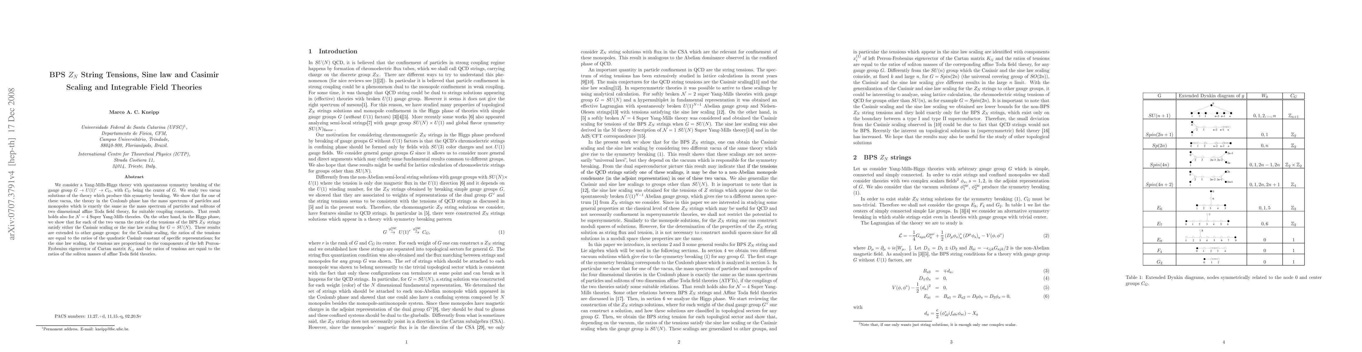 We consider a Yang-Mills-Higgs theory with spontaneous symmetry breaking of the gauge group G -> U(1)^r -> C(G), with C(G) being the center of G. We study two vacua solutions of the theory which produce this symmetry breaking. We show that for one of these vacua, the theory in the Coulomb phase has the mass spectrum of particles and monopoles which is exactly the same as the mass spectrum of particles and solitons of two dimensional affine Toda field theory. That result holds also for N=4 Super Yang-Mills theories. On the other hand, in the Higgs phase, we show that for each of the two vacua the ratio of the tensions of the BPS Z(N) strings satisfy either the Casimir scaling or the sine law scaling for G=SU(N). These results are extended to other gauge groups: for the Casimir scaling, the ratios of the tensions are equal to the ratios of the quadratic Casimir constant of specific representations; for the sine law scaling, the tensions are proportional to the components of the left Perron-Frobenius eigenvector of Cartan matrix and the ratios of tensions are equal to the ratios of the soliton masses of affine Toda field theories.