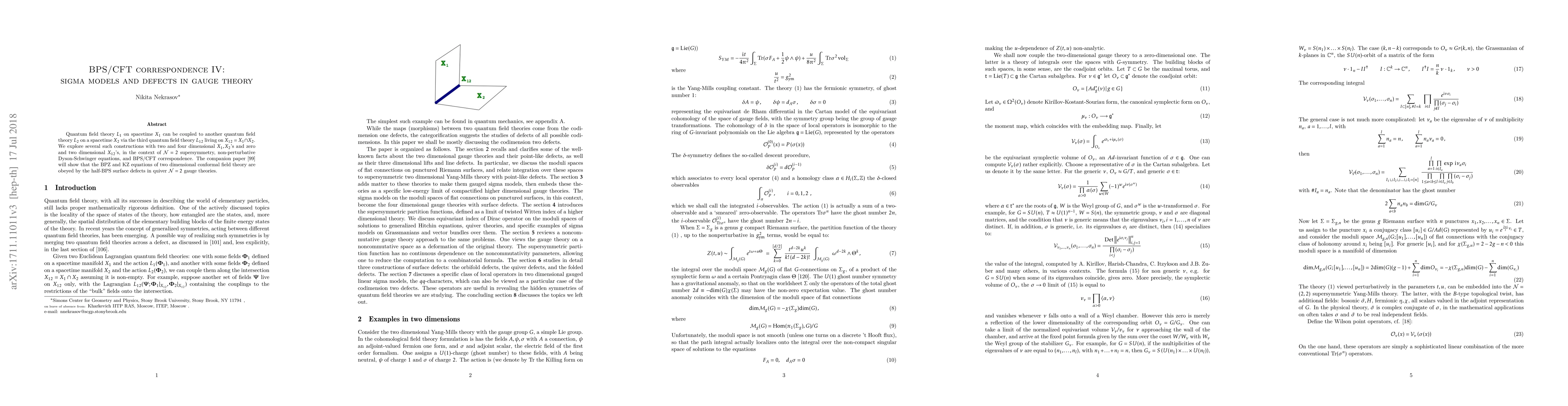 This paper investigates the coupling of quantum field theories $L_1$ and $L_2$ via intermediary theory $L_{12}$, focusing on $\mathcal{N}=2$ supersymmetric sigma models and defects in gauge theory. It explores constructions in various dimensionalities and examines their adherence to BPS/CFT correspondence, setting the stage for subsequent analysis of BPZ and KZ equations in surface defects.