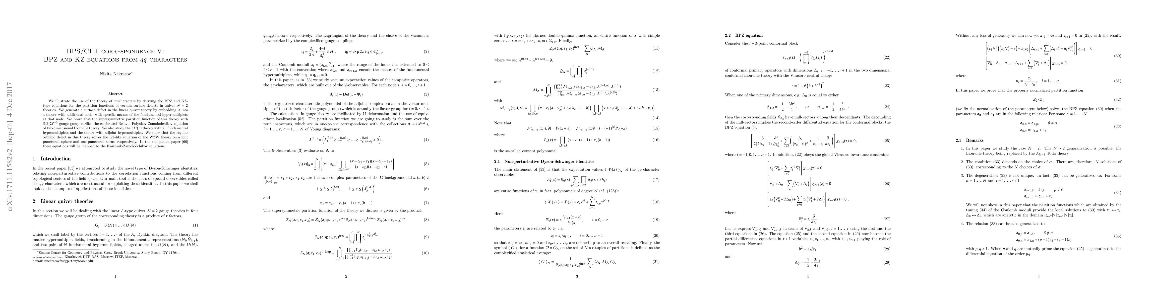 This paper derives BPZ and KZ-type equations for partition functions of surface defects in ${\mathcal N}=2$ quiver theories using $qq$-characters. It demonstrates that these partition functions satisfy Belavin-Polyakov-Zamolodchikov equations and KZ-like equations for specific configurations, paving the way for mapping these results to Knizhnik-Zamolodchikov equations in a subsequent paper.