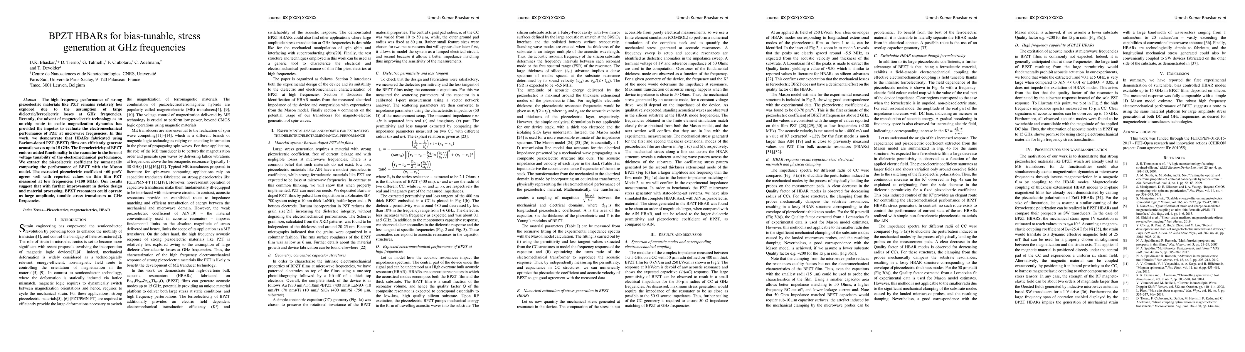 The high frequency performance of strong piezoelectric materials like PZT remains relatively less explored due to the assumption of large dielectric/ferroelectric losses at GHz frequencies. Recently, the advent of magnetoelectric technology as an on-chip route to excite magnetization dynamics has provided the impetus to evaluate the electromechanical performance of PZT at microwave frequencies. In this work, we demonstrate that HBARs fabricated using Barium-doped PZT (BPZT) films can efficiently generate acoustic waves up to 15 GHz. The ferroelectricity of BPZT endows added functionality to the resonator in the form of voltage tunability of the electromechanical performance. We extract the piezoelectric coefficient by numerically comparing the performance of BPZT with the Mason model. The extracted piezoelectric coefficient ~60 pm/V agrees well with reported values on thin film PZT measured at low frequencies (<100 MHz). Our results suggest that with further improvement in device design and material processing, BPZT resonators could operate as large amplitude, tunable stress transducers at GHz frequencies.