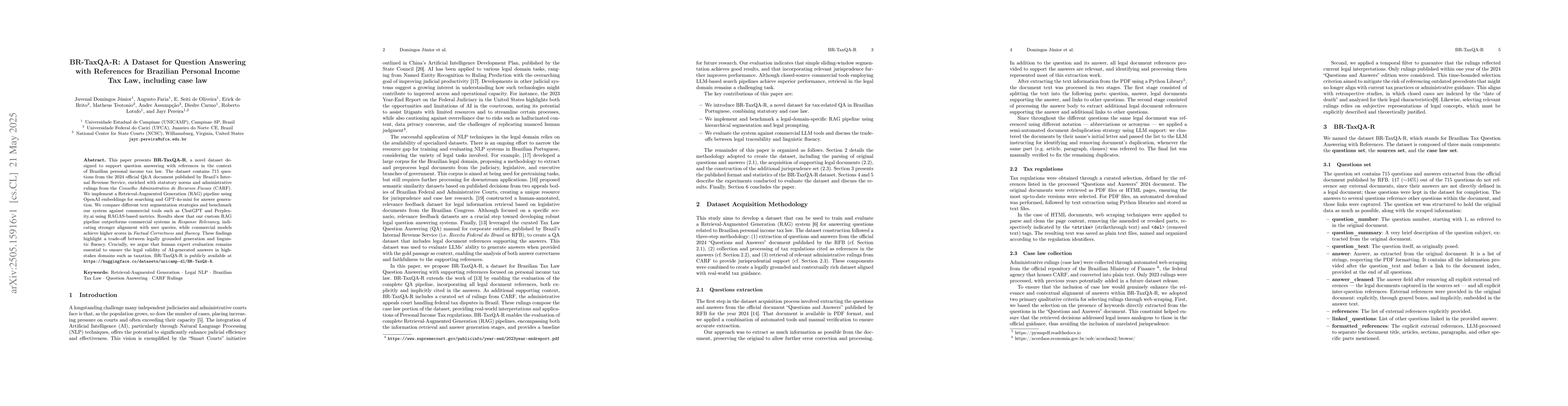 The research presents BR-TaxQA-R, a dataset for question answering with references tailored to Brazilian personal income tax law. It combines questions from the 2024 official Q&A document with statutory norms and administrative rulings from CARF, implementing a Retrieval-Augmented Generation (RAG) pipeline using OpenAI embeddings and GPT-4o-mini for answer generation.