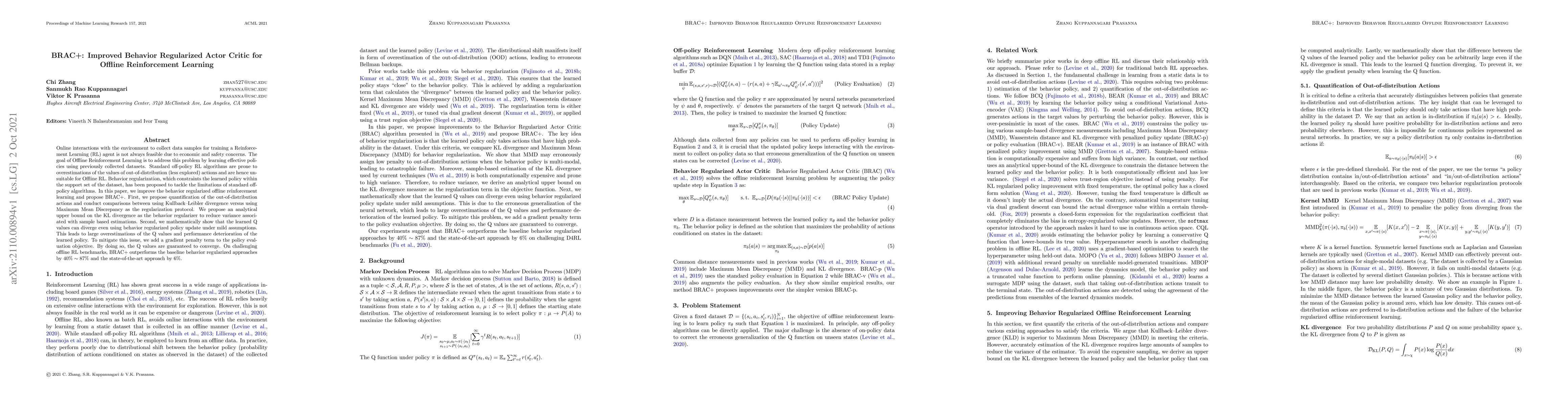 Online interactions with the environment to collect data samples for training a Reinforcement Learning (RL) agent is not always feasible due to economic and safety concerns. The goal of Offline Reinforcement Learning is to address this problem by learning effective policies using previously collected datasets. Standard off-policy RL algorithms are prone to overestimations of the values of out-of-distribution (less explored) actions and are hence unsuitable for Offline RL. Behavior regularization, which constraints the learned policy within the support set of the dataset, has been proposed to tackle the limitations of standard off-policy algorithms. In this paper, we improve the behavior regularized offline reinforcement learning and propose BRAC+. First, we propose quantification of the out-of-distribution actions and conduct comparisons between using Kullback-Leibler divergence versus using Maximum Mean Discrepancy as the regularization protocol. We propose an analytical upper bound on the KL divergence as the behavior regularizer to reduce variance associated with sample based estimations. Second, we mathematically show that the learned Q values can diverge even using behavior regularized policy update under mild assumptions. This leads to large overestimations of the Q values and performance deterioration of the learned policy. To mitigate this issue, we add a gradient penalty term to the policy evaluation objective. By doing so, the Q values are guaranteed to converge. On challenging offline RL benchmarks, BRAC+ outperforms the baseline behavior regularized approaches by 40%~87% and the state-of-the-art approach by 6%.