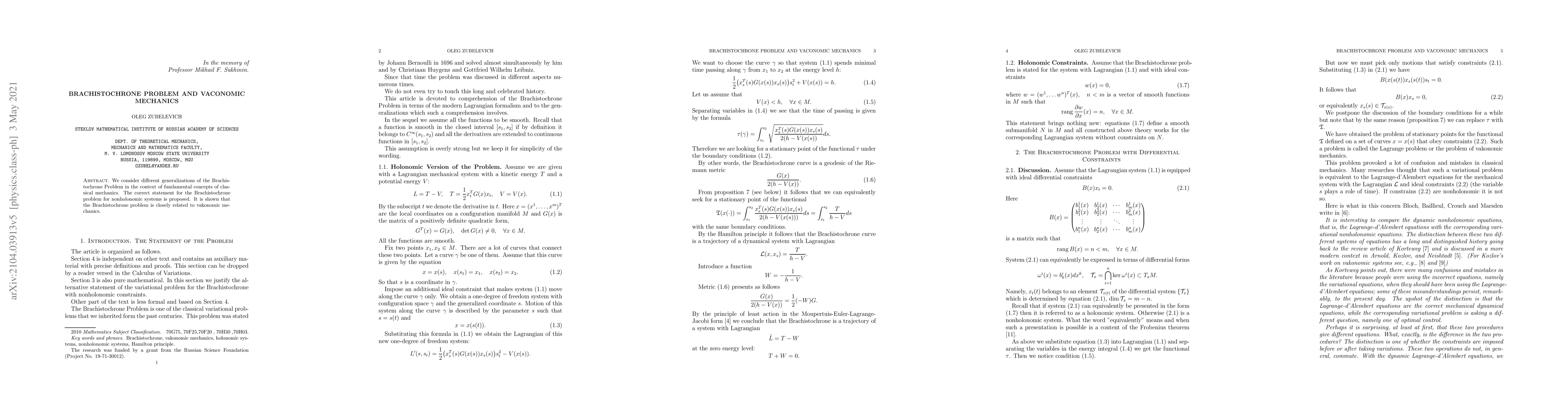 Summary: This paper generalizes the Brachistochrone Problem within classical mechanics, proposing a correct statement for nonholonomic systems and demonstrating its connection to vakonomic mechanics, a subset of analytical mechanics.