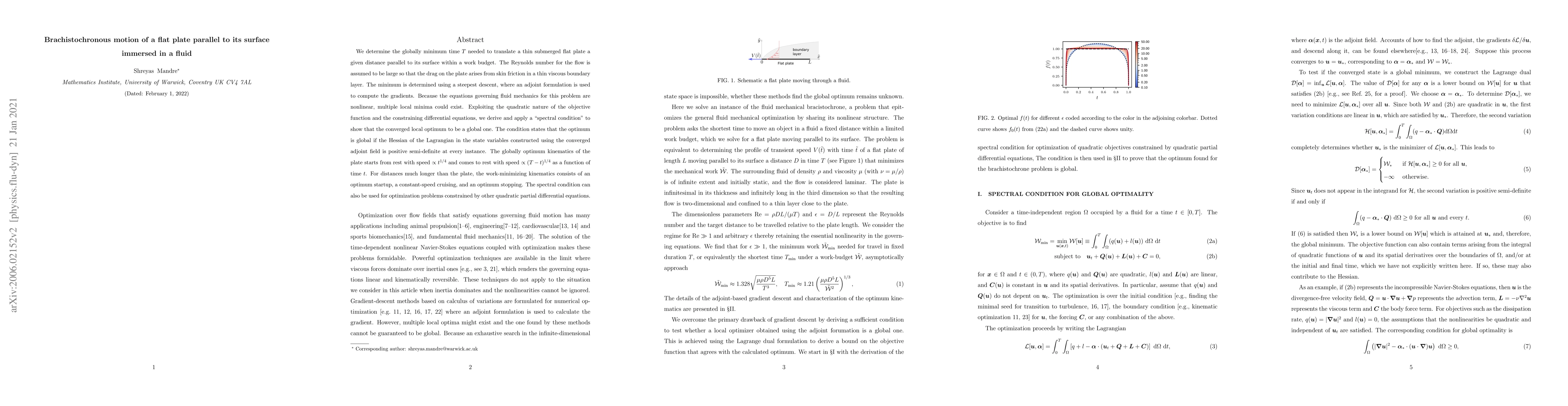 We determine the globally minimum time $T$ needed to translate a thin submerged flat plate a given distance parallel to its surface within a work budget. The Reynolds number for the flow is assumed to be large so that the drag on the plate arises from skin friction in a thin viscous boundary layer. The minimum is determined using a steepest descent, where an adjoint formulation is used to compute the gradients. Because the equations governing fluid mechanics for this problem are nonlinear, multiple local minima could exist. Exploiting the quadratic nature of the objective function and the constraining differential equations, we derive and apply a "spectral condition" to show that the converged local optimum to be a global one. The condition states that the optimum is global if the Hessian of the Lagrangian in the state variables constructed using the converged adjoint field is positive semi-definite at every instance. The globally optimum kinematics of the plate starts from rest with speed $\propto t^{1/4}$ and comes to rest with speed $\propto (T-t)^{1/4}$ as a function of time $t$. For distances much longer than the plate, the work-minimizing kinematics consists of an optimum startup, a constant-speed cruising, and an optimum stopping. The spectral condition can also be used for optimization problems constrained by other quadratic partial differential equations.