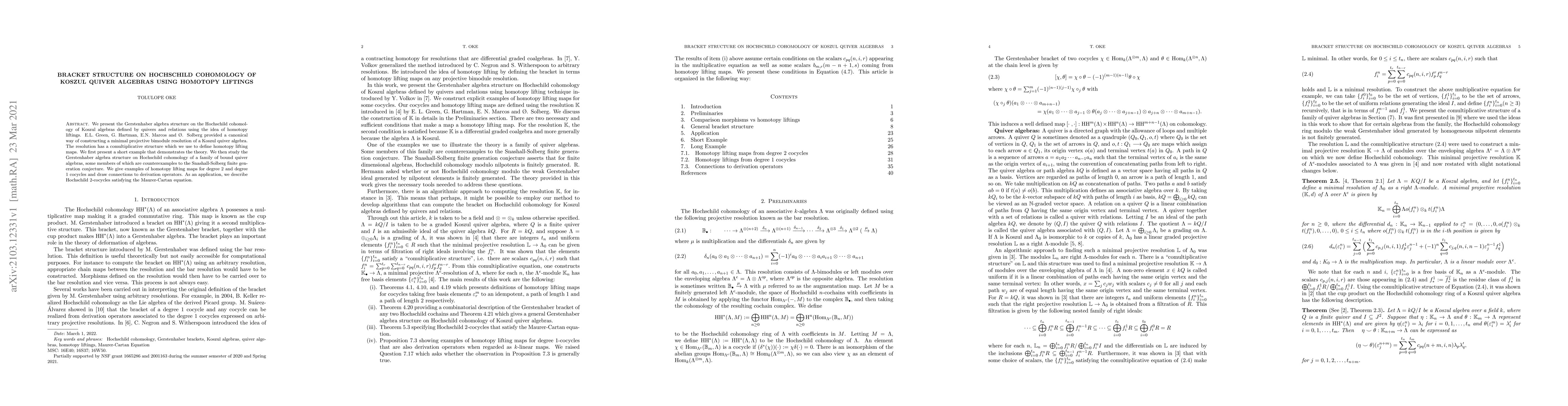 This paper explores the Gerstenhaber algebra structure on Hochschild cohomology of Koszul quiver algebras, employing homotopy liftings derived from a minimal projective bimodule resolution. It includes examples to illustrate the theory and discusses applications to Hochschild 2-cocycles and counterexamples to the Snashall-Solberg conjecture.