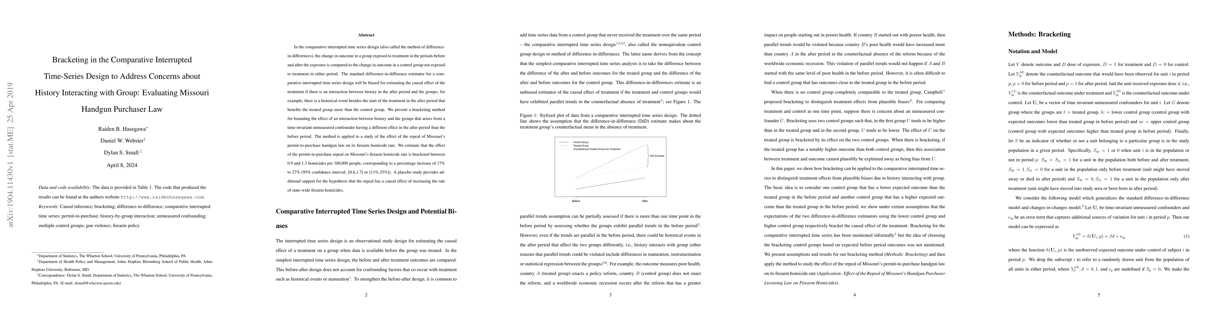 In the comparative interrupted time series design (also called the method of difference-in-differences), the change in outcome in a group exposed to treatment in the periods before and after the exposure is compared to the change in outcome in a control group not exposed to treatment in either period. The standard difference-in-difference estimator for a comparative interrupted time series design will be biased for estimating the causal effect of the treatment if there is an interaction between history in the after period and the groups; for example, there is a historical event besides the start of the treatment in the after period that benefits the treated group more than the control group. We present a bracketing method for bounding the effect of an interaction between history and the groups that arises from a time-invariant unmeasured confounder having a different effect in the after period than the before period. The method is applied to a study of the effect of the repeal of Missouri's permit-to-purchase handgun law on its firearm homicide rate. We estimate that the effect of the permit-to-purchase repeal on Missouri's firearm homicide rate is bracketed between 0.9 and 1.3 homicides per 100,000 people, corresponding to a percentage increase of 17% to 27% (95% confidence interval: [0.6,1.7] or [11%,35%]). A placebo study provides additional support for the hypothesis that the repeal has a causal effect of increasing the rate of state-wide firearm homicides.