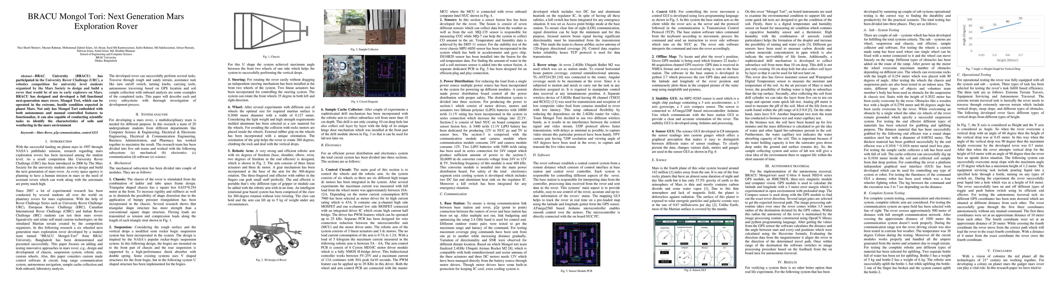 BRAC University (BRACU) has participated in the University Rover Challenge (URC), a robotics competition for university level students organized by the Mars Society to design and build a rover that would be of use to early explorers on Mars. BRACU has designed and developed a full functional next-generation mars rover, Mongol Tori, which can be operated in the extreme, hostile condition expected in planet Mars. Not only has Mongol Tori embedded with both autonomous and manual controlled features to functionalize, it can also capable of conducting scientific tasks to identify the characteristics of soils and weathering in the mars environment.