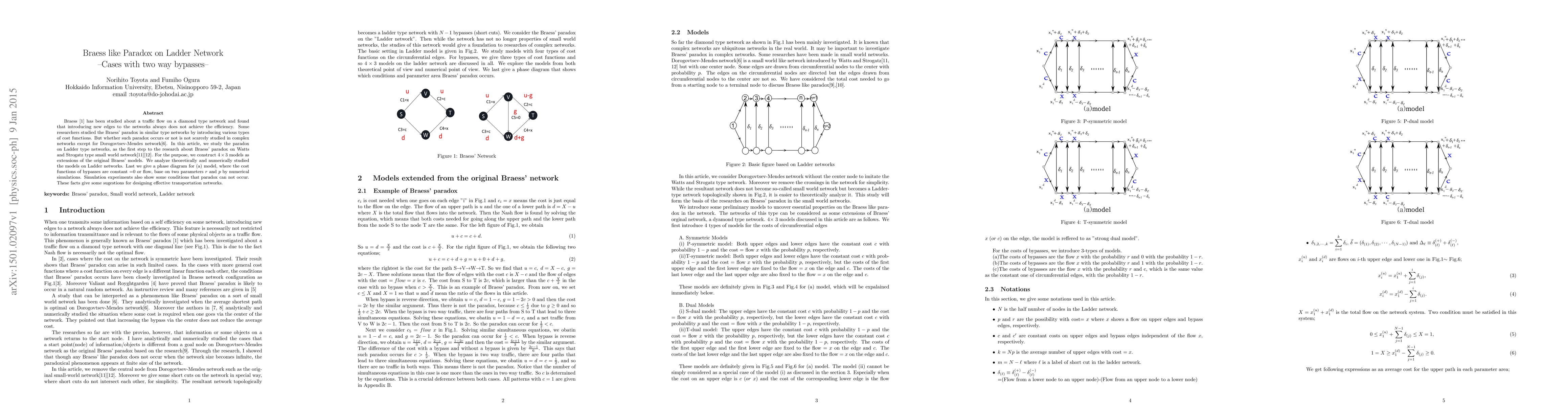 Braess \cite{1} has been studied about a traffic flow on a diamond type network and found that introducing new edges to the networks always does not achieve the efficiency. Some researchers studied the Braess' paradox in similar type networks by introducing various types of cost functions. But whether such paradox occurs or not is not scarcely studied in complex networks except for Dorogovtsev-Mendes network\cite{2}. In this article, we study the paradox on Ladder type networks, as the first step to the research about Braess' paradox on Watts and Strogatz type small world network\cite{Watt1}\cite{Watt2}. %We theoretically and numerically studied Braess' paradox on Ladder networks. For the purpose, we construct $4 \times 3$ models as extensions of the original Braess' models. We analyze theoretically and numerically studied the models on Ladder networks. Last we give a phase diagram for (a) model, where the cost functions of bypasses are constant =0 or flow, base on two parameters $r$ and $p$ by numerical simulations. Simulation experiments also show some conditions that paradox can not occur. These facts give some sugestions for designing effective transportation networks.