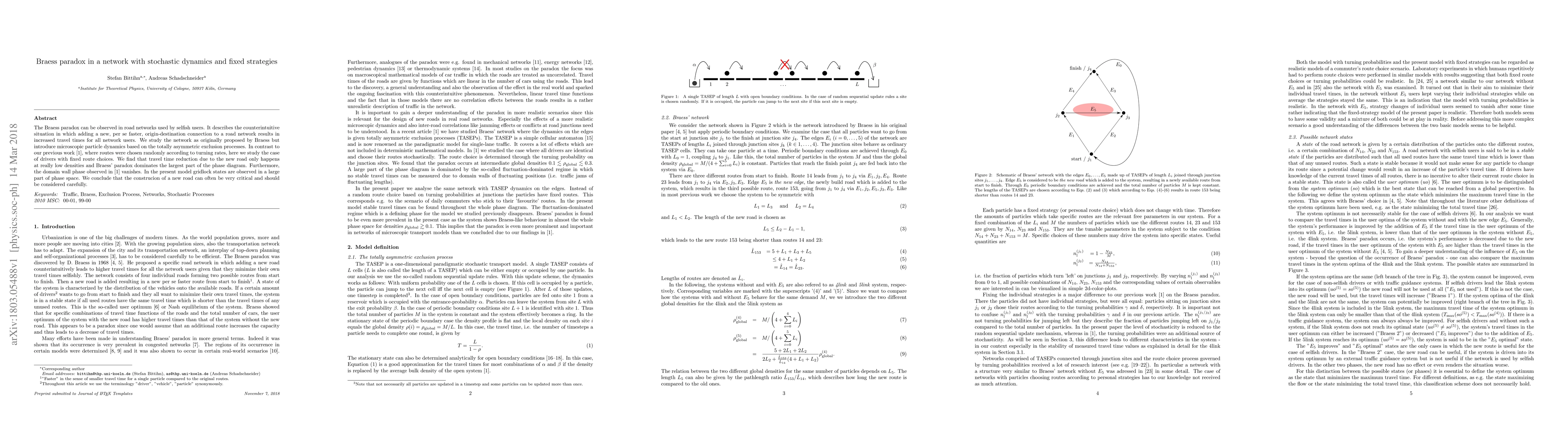 This research investigates the Braess paradox in road networks with selfish users, using microscopic particle dynamics based on totally asymmetric exclusion processes. Unlike previous studies, it focuses on drivers with fixed route choices. Key findings include that travel time reduction due to new roads occurs only at low densities, and Braess' paradox dominates, leading to gridlock states in large parts of phase space. The study concludes that new road construction can have significant, negative consequences and should be carefully considered.