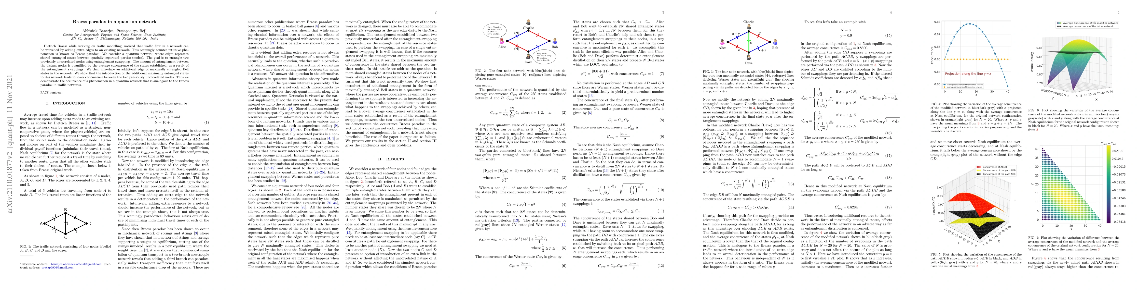 The paper explores the Braess paradox in a quantum network, demonstrating that adding extra entangled states can paradoxically reduce the entanglement between two previously uncorrelated nodes, analogous to how adding roads can worsen traffic flow. This counterintuitive result is quantified by the concurrence of the resulting entangled states.