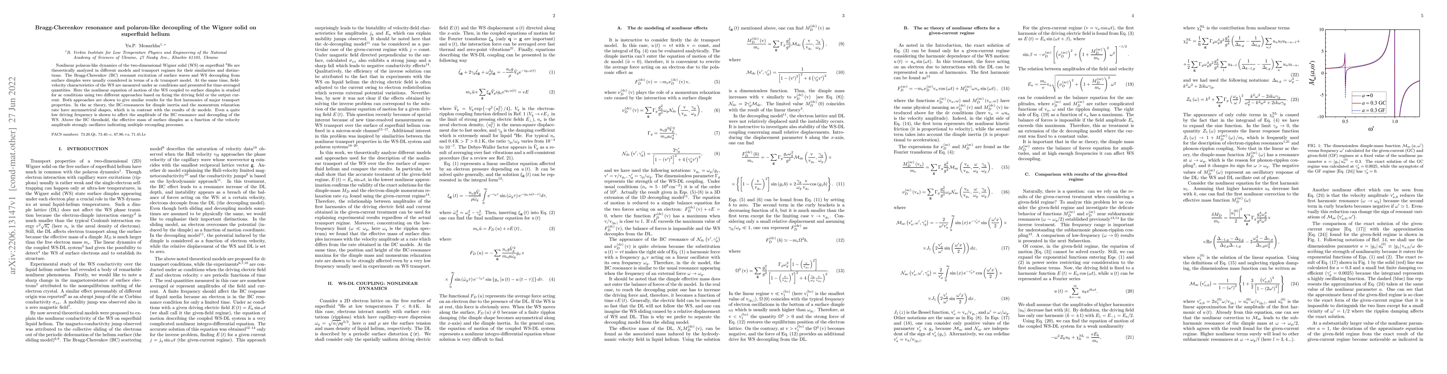 Nonlinear polaron-like dynamics of the two-dimensional Wigner solid (WS) on superfluid $^{4}\mathrm{He}$ are theoretically analyzed in different models and transport regimes for their similarities and distinctions. The Bragg-Cherenkov (BC) resonant excitation of surface waves and WS decoupling from surface dimples were usually considered in terms of a dc transport model. At the same time, field-velocity characteristics of the WS are measured under ac conditions and presented for time-averaged quantities. Here the nonlinear equation of motion of the WS coupled to surface dimples is studied for ac conditions using two different approaches based on fixing the driving field or the output current. Both approaches are shown to give similar results for the first harmonics of major transport properties. In the ac theory, the BC-resonances for dimple inertia and the momentum relaxation rate have asymmetrical shapes, which is in contrast with the results of dc models. Even a quite low driving frequency is shown to affect the amplitude of the BC resonance and decoupling of the WS. Above the BC threshold, the effective mass of surface dimples as a function of the velocity amplitude strongly oscillates indicating multiple recoupling processes.