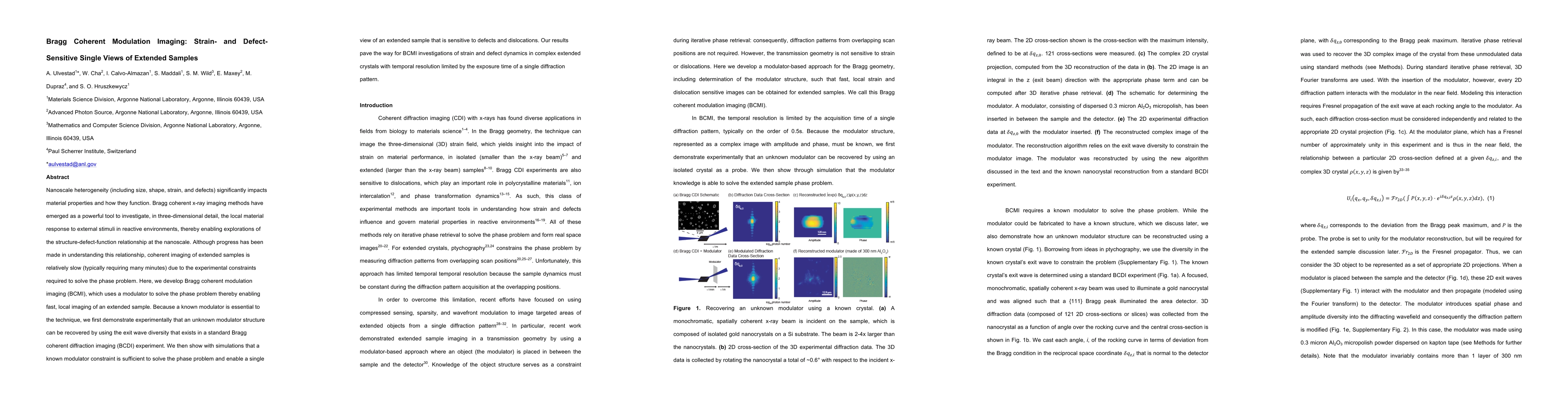 This paper introduces Bragg coherent modulation imaging (BCMI) to rapidly capture three-dimensional nanoscale strain and defect details in extended samples. The method uses a modulator to solve the phase problem, enabling fast imaging and revealing defect dynamics in complex crystals.