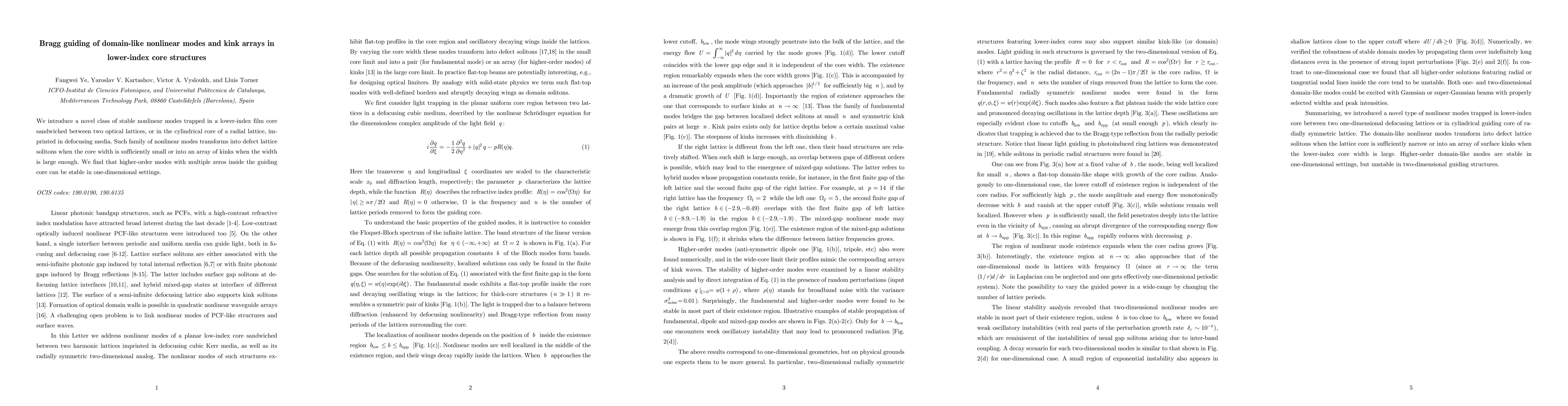 We introduce a novel class of stable nonlinear modes trapped in a lower-index film core sandwiched between two optical lattices, or in the cylindrical core of a radial lattice, imprinted in defocusing media. Such family of nonlinear modes transforms into defect lattice solitons when the core width is sufficiently small or into an array of kinks when the width is large enough. We find that higher-order modes with multiple zeros inside the guiding core can be stable in one-dimensional settings.