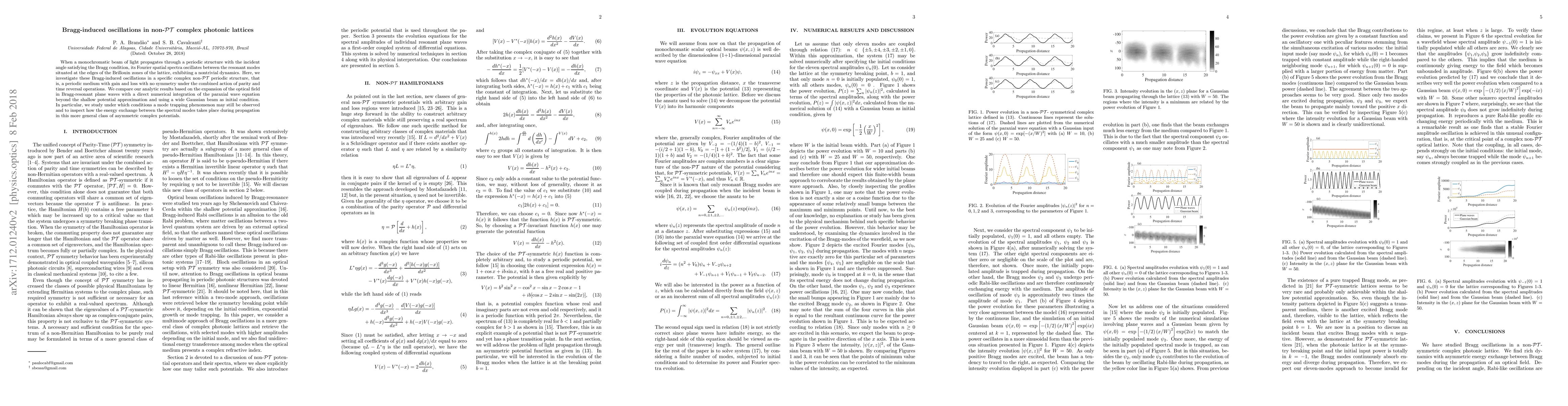 When a monochromatic beam of light propagates through a periodic structure with the incident angle satisfying the Bragg condition, its Fourier spatial spectra oscillates between the resonant modes situated on the edges of the Brillouin zones of the lattice with a nontrivial dynamics. We wish to study here these Bragg-induced oscillations in a specific non-PT periodic structure, that is, a periodic medium not invariant under the combined action of parity and time reversal symmetries. We compare our analytic results based on the expansion of the optical field in Bragg-resonant plane waves with direct numerical integration of the paraxial wave equation using a wide Gaussian beam as initial condition without assuming the shallow potential approximation. In particular, we wish to investigate under what conditions a mode trapping phenomenon can still be observed and to verify closely how the energy exchange between the spectral modes takes place during propagation in this more general class of potentials with arbitrary gain and loss profiles.