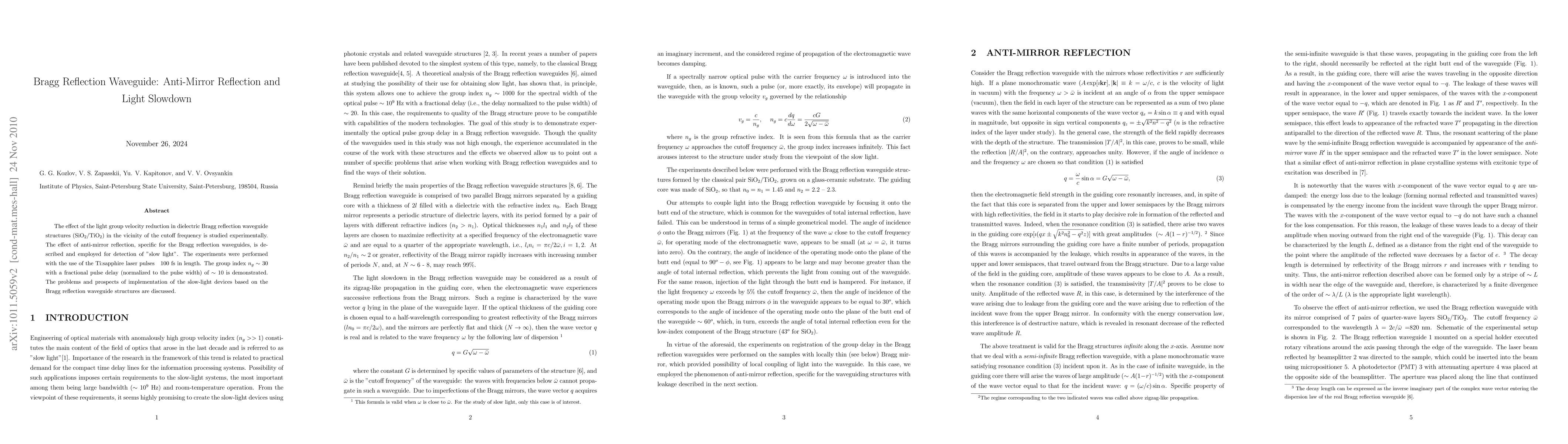 The study experimentally investigates light group velocity reduction in SiO$_2$/TiO$_2$ Bragg reflection waveguides near cutoff frequency, demonstrating significant slowdown and employing anti-mirror reflection for "slow light" detection, achieving a group index of ~30 and a fractional pulse delay of ~10. Prospects for implementing slow-light devices in such structures are also explored.