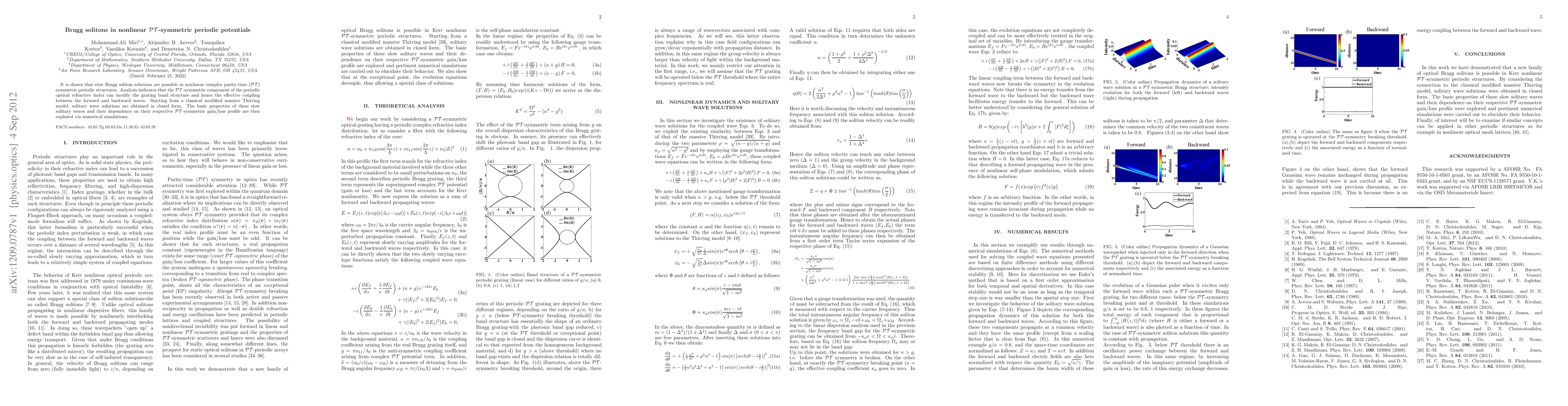This paper demonstrates the existence of slow Bragg solitons in nonlinear PT-symmetric periodic potentials, showing how the PT-symmetric refractive index modifies the grating band structure. Numerical simulations reveal the properties of these solitons and their dependence on PT-symmetric gain/loss profiles.