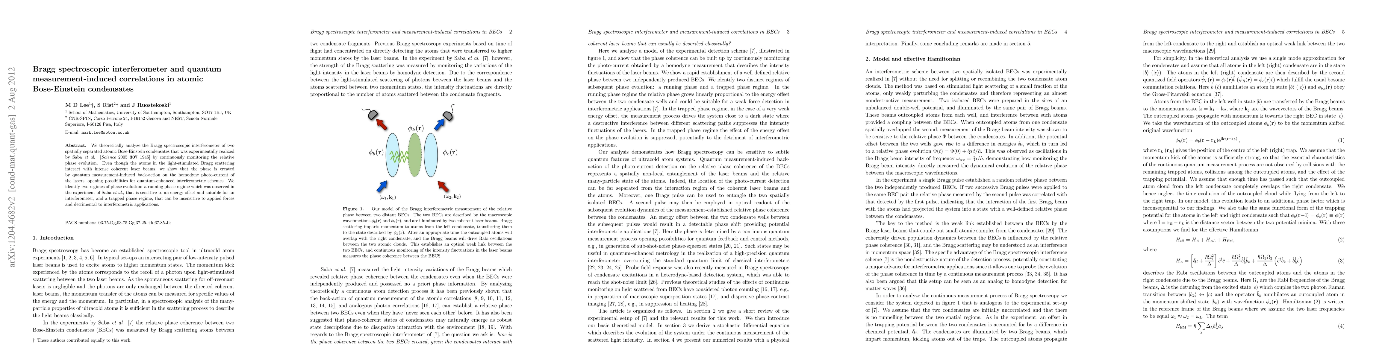 This paper theoretically analyzes a Bragg spectroscopic interferometer in two spatially separated atomic Bose-Einstein condensates, revealing quantum measurement-induced back-action on laser homodyne photo-currents. It identifies two phase evolution regimes: a running phase suitable for interferometry and a trapped phase that is force-insensitive but detrimental to interferometric applications.