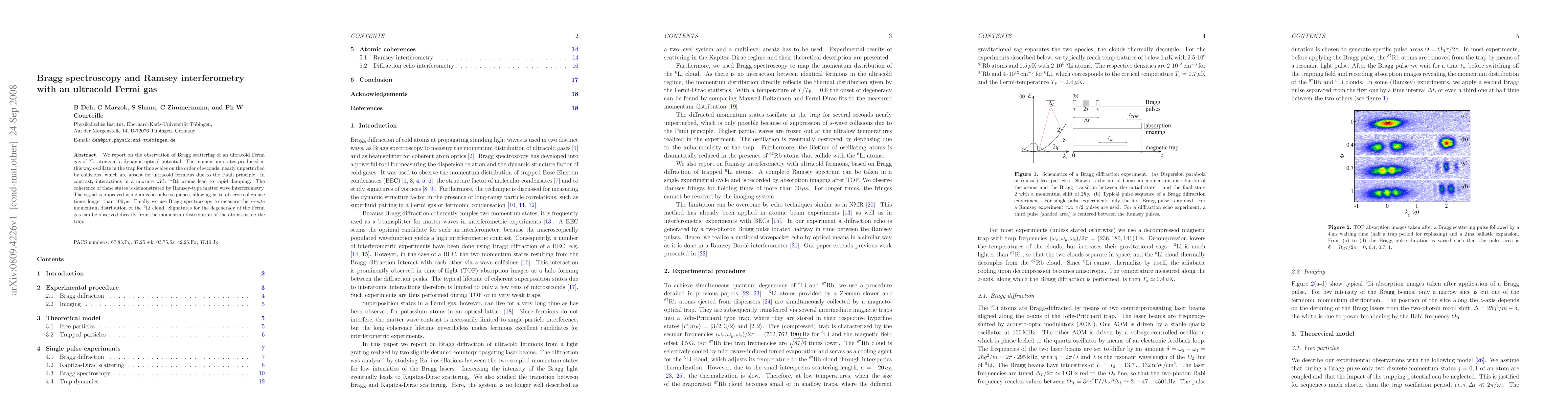 This paper reports on the use of Bragg scattering to manipulate ultracold Fermi gas of 6Li atoms, observing long-lived coherence times due to the absence of collisions among fermions. Ramsey interferometry with an echo pulse sequence demonstrates coherence, and Bragg spectroscopy reveals the momentum distribution, showing signatures of Fermi degeneracy.